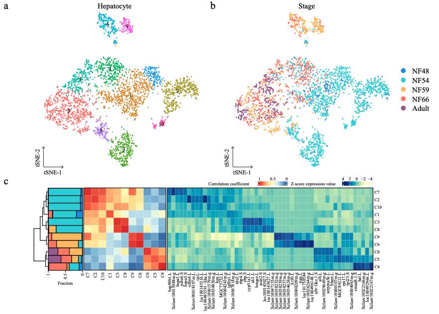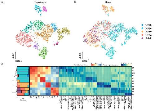Supplementary Figure 12. [panels a b c ] The correlation between larval and adult cell types. t-SNE maps of single-cell data from larval and adult hepatocytes (a) and neurons (d). Cells are colored by cell-type cluster; t-SNE maps of single-cell data from larval and adult hepatocytes (b) and neurons (e). Cells are colored by stage. Heatmap showing representative gene expression and correlation of larval and adult hepatocytes (c) and neurons (f). AUROC scores were used to measure the similarity of cell types: red, high correlation; blue and yellow, low correlation, based on the Spearman correlation. The stacked bar plots illustrate the proportion of clusters. Stage is marked by different colors same as b and d, respectively.