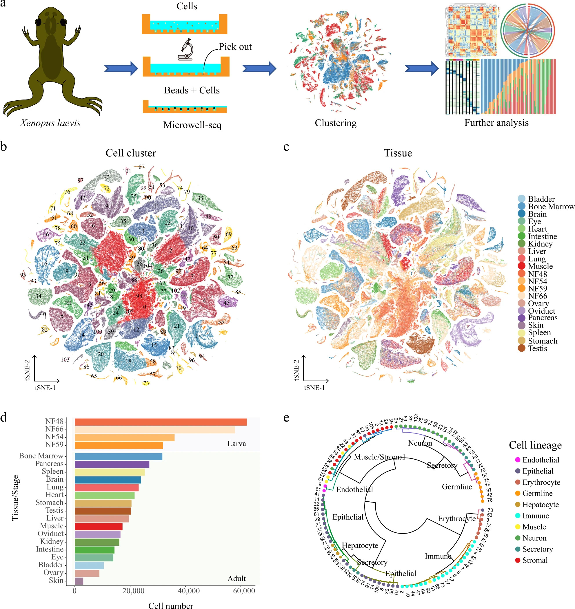 a A schematic of the basic workflow for the Xenopus cell landscape using the Microwell-seq platform. b t-SNE analysis of 501, 358 single cells collected from larval and adult tissues. The 106 cell-type clusters are labeled in different colors. Cell cluster markers are listed in Supplementary Dataset 1. c t-SNE analysis of 501, 358 single cells collected from larval and adult tissues. Tissues/stages are labeled in different colors. d Cell number of each tissue/stage is detected at the XCL. Tissues/stages are labeled in different colors. e The 106 cell-type clusters are re-clustered into ten cell lineages and circles showing the relationships among the 106 cell types. Cell lineages are labeled in different colors.