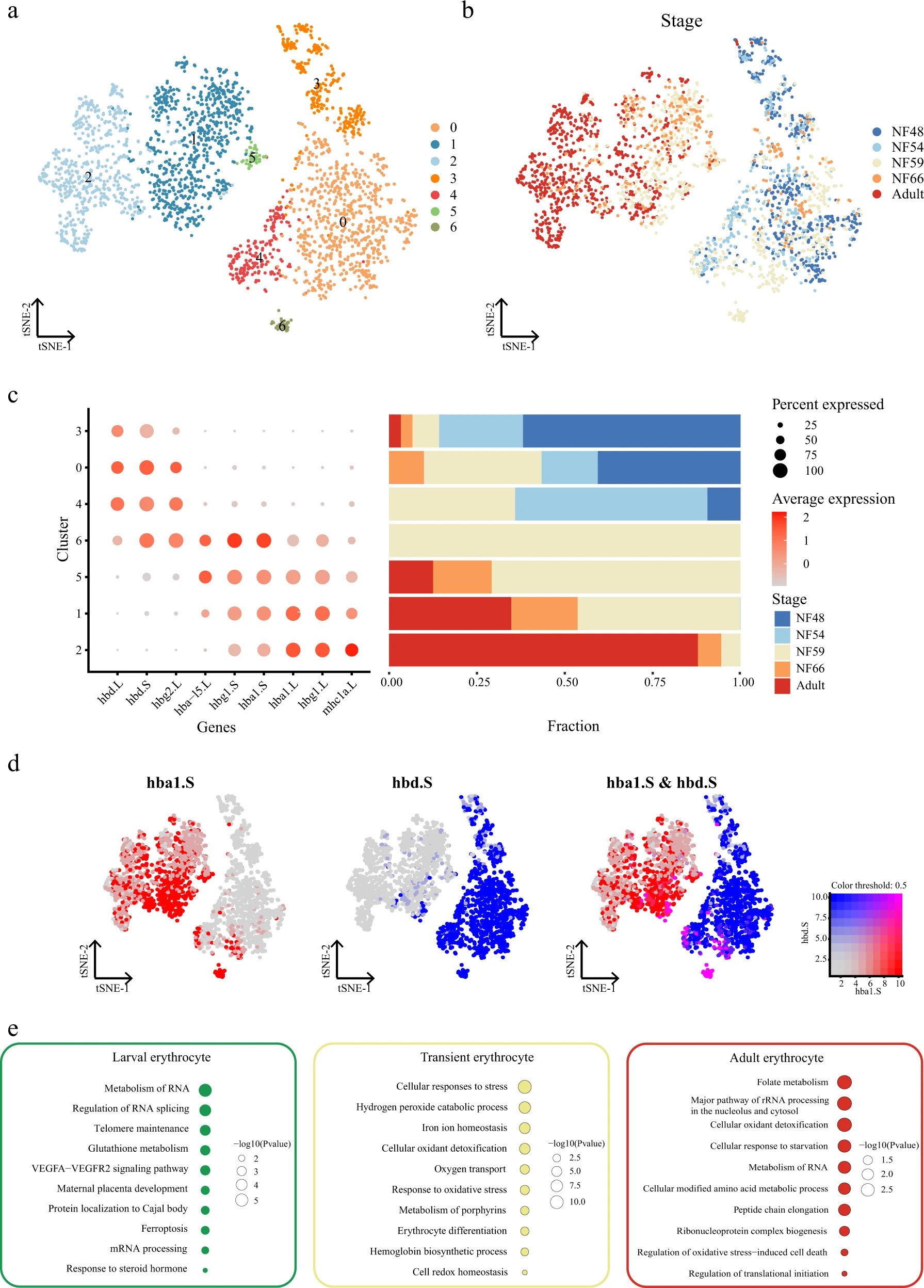 a t-SNE analysis of erythrocytes collected from larval and adult Xenopus. Different clusters are labeled in different colors. Erythrocytes from adults were sampled to the same order of magnitude as in larva. Cell cluster markers are listed in Supplementary Dataset 3. b t-SNE analysis of erythrocytes collected from larval and adult Xenopus. Different stages are labeled in different colors. c Representative gene expression in each cluster of erythrocytes and cell proportions in different stages are shown. Stages are labeled in different colors. The size of the dot encodes the percentage of cells within a cell type, and the color encodes the average expression level. d Feature plot in the t-SNE map of erythrocytes collected from larval and adult Xenopus. Cells are colored according to the expression of the indicated marker genes hba1.S (red), hbd.S (blue), and co-expression hba1.S and hbd.S (pink). e Representative GO terms enriched in each module for three cell types. Different cell clusters are labeled in different colors. P value was calculated by the hypergeometric distribution, a statistical test is one-sided, adjustments P values were made after P value is corrected by BenjaminâHochberg multiple test.