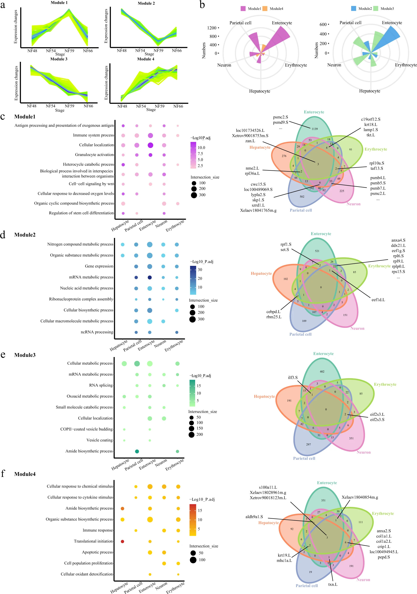 a Schematic diagram of the four modules. b Rose diagrams showing the distribution of DEGs in each cell type. Different modules are labeled in different colors. c–f Representative GO terms enriched in module 1 (c), 2 (d), 3 (e), and 4 (f) for five cell types, respectively (left). GO terms enriched in different modules are labeled in different colors. Venn diagrams showing the numbers of shared genes in each module (right). The bold lines indicate the representative genes shared in at least three cell types. P value was calculated by the hypergeometric distribution, statistical test is one-sided, adjustments P values were made after P value is corrected by Benjamin–Hochberg multiple tests.