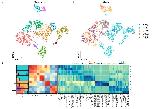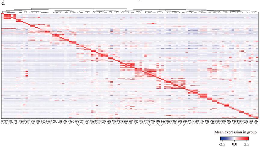 Supplementary Figure 1. [panel d] Details of XCL construction. a, Number of genes per cell detected for each tissue/stage in the XCL. b, Number of UMIs per cell detected for each tissue/stage in the XCL. c, Number of subclusters detected for each tissue/stage in the XCL. d, Heatmap showing representative gene expression in each cell cluster in the XCL.