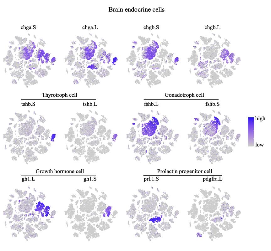 Supplementary Figure 2. Representative gene expression in endocrine cells of the Xenopus brain. Feature plot in the t-SNE map of adult Xenopus brain single-cell data. Kinds of endocrine cells are colored according to the expression of the indicated marker genes: co- expressed high levels of chga and chgb but different hormone-associated genes.