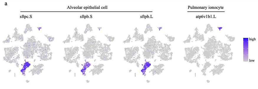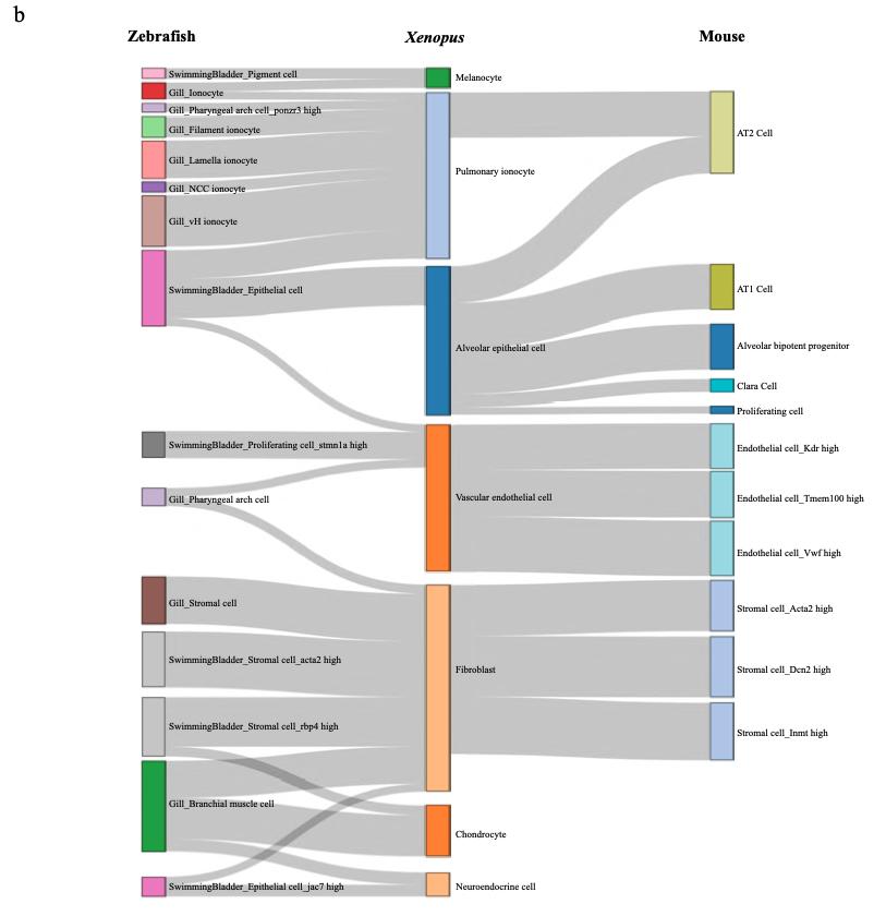 Supplementary Figure 3. [ panel a] Details of cellular heterogeneity in adult Xenopus lung. a, Feature plot in the t-SNE map of adult Xenopus lung single-cell data. Cells are colored according to the expression of the indicated marker genes. b, Sankey plot showing the relationships among the Xenopus lung, mouse lung, zebrafish gill and swim bladder. Different cell clusters in each species are marked in different color boxes.