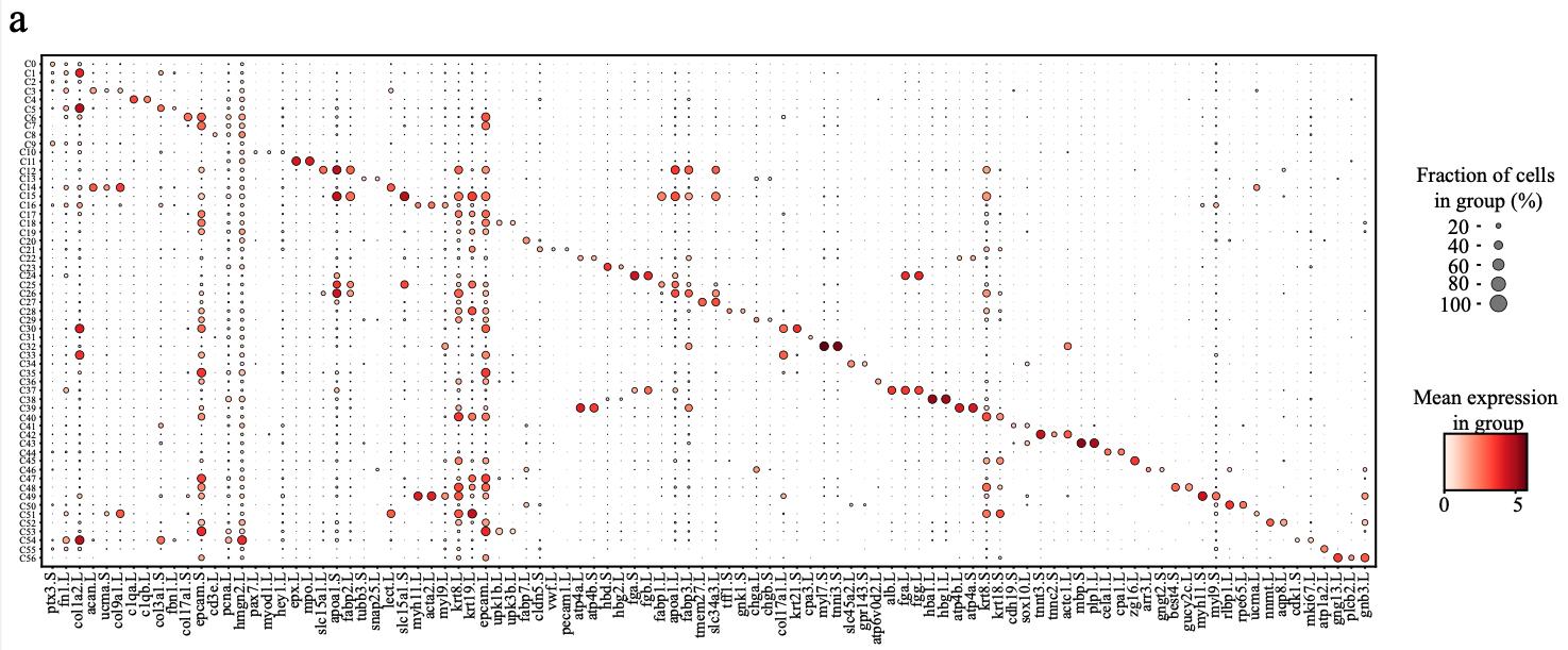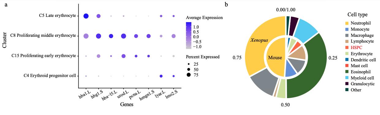 Supplementary Figure 4. Details of cellular heterogeneity in adult Xenopus liver and bone marrow. a, Representative gene expression in each cluster of liver erythrocytes in different stages. The size of the dot encodes the percentage of cells within a cell type, and the color encodes the average expression level. b, Cell proportions of bone marrow in Xenopus (outer circle) and mouse (inside circle). Cell types are labeled in different colors.