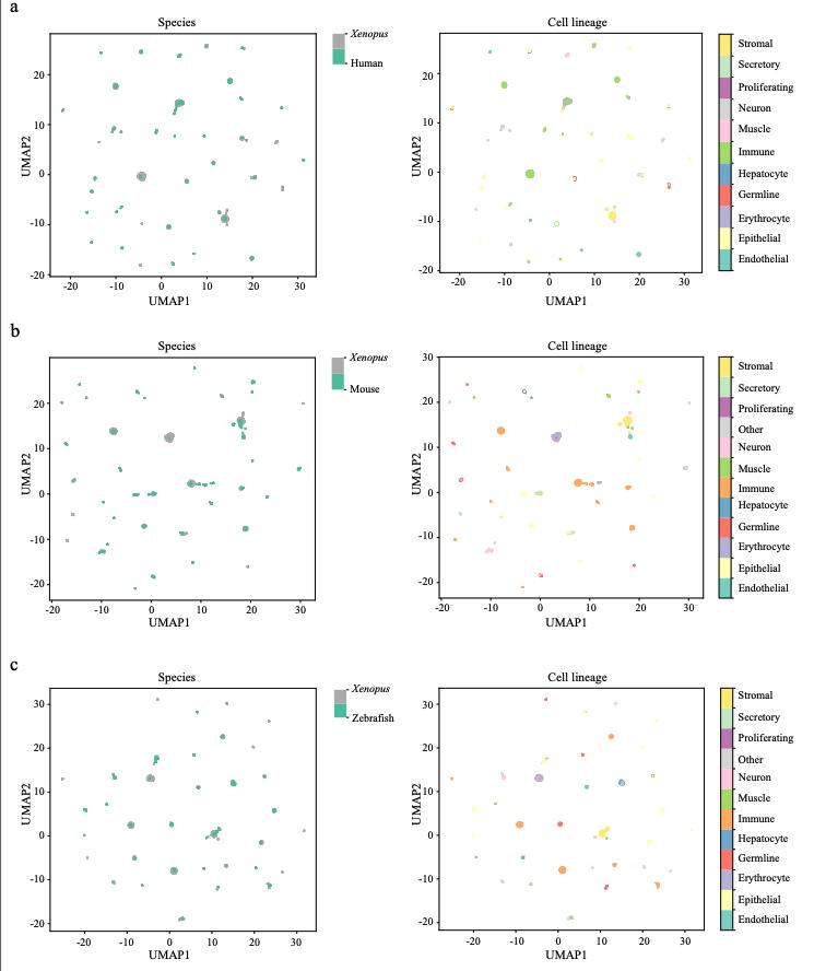 Supplementary Figure 6. The UMAP projection of combined species. The UMAP projection of the combined human and Xenopus (a), mouse and Xenopus (b), zebrafish and Xenopus (c) manifolds are visualized, colored by species (left) and lineages (right) respectively. Cells are colored by cell-type cluster.