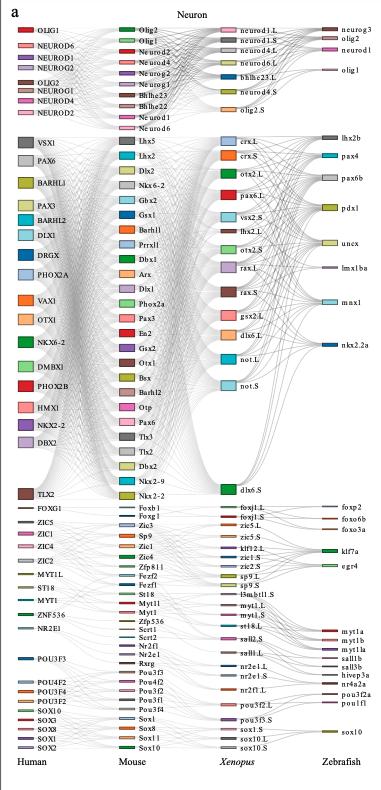 Supplementary Figure 8. [panel a neuronal] The common lineage-specific TFs for each lineage. Sankey plot showing common lineage-specific TFs in neuron (a), muscle (b) and stromal (c). Different TFs in each species are marked in different color boxes. Homologous TFs between species obtained from SAMap are connected by lines.