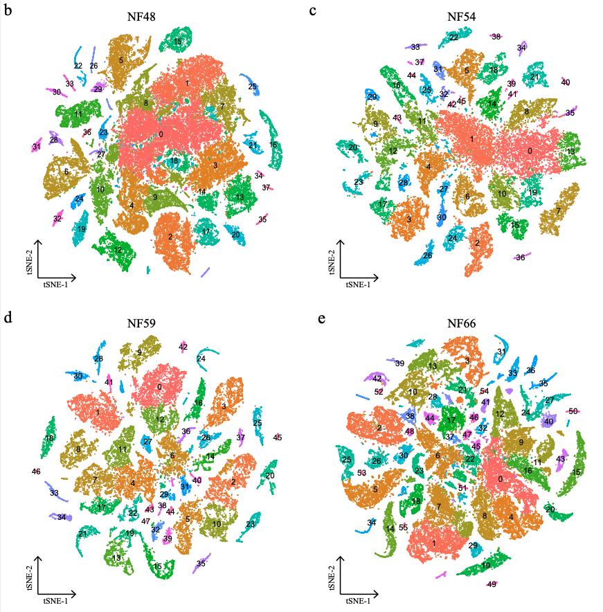 Supplementary Figure 9. [panels b c d e] Details of the constructed larval Xenopus cell atlas during metamorphosis. a, Dot plot showing representative gene expression in each cluster of larval Xenopus during metamorphosis. The size of the dot encodes the percentage of cells within a cell type, and the color encodes the average expression level. b-e, t-SNE analysis of four tadpole stages collected to represent larval Xenopus. Cells are colored by cell-type cluster.
