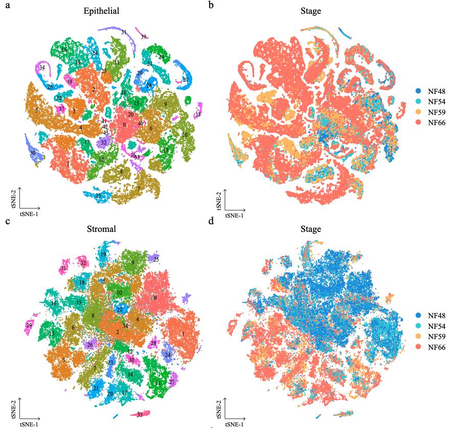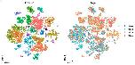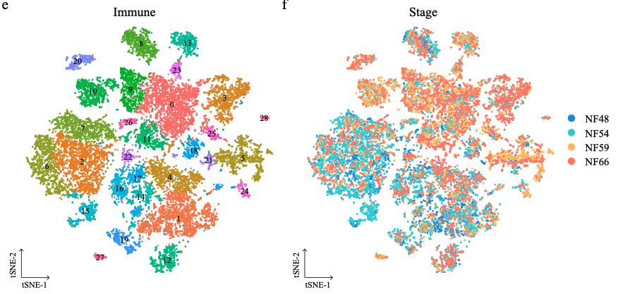 Supplementary Figure 10. [panel c] Cellular heterogeneity of larval Xenopus cell lineages. t-SNE maps of single-cell data from larval epithelial (a), stromal (c) and immune (e) during metamorphosis. Cells are colored by cell-type cluster; t-SNE maps of single-cell data from larval epithelial (b), stromal (d) and immune (f) during metamorphosis. Cells are colored by stage.