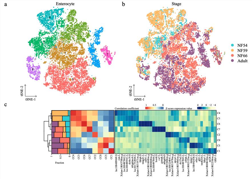Supplementary Figure 11. [panels a b c] The correlation between larval and adult cell types. t-SNE maps of single-cell data from larval and adult enterocytes (a) and stomach parietal cells (d). Cells are colored by cell-type cluster; t-SNE maps of single-cell data from larval and adult enterocytes (b) and stomach parietal cells (e). Cells are colored by stage. Heatmap showing representative gene expression and correlation of larval and adult enterocytes (c) and stomach parietal cells (f). AUROC scores were used to measure the similarity of cell types: red, high correlation; blue and yellow, low correlation, based on the Spearman correlation. The stacked bar plots illustrate the proportion of clusters. Stage is marked by different colors same as b and d, respectively.