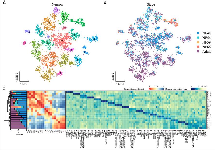 Supplementary Figure 12. [panels d e f ] The correlation between larval and adult cell types. t-SNE maps of single-cell data from larval and adult hepatocytes (a) and neurons (d). Cells are colored by cell-type cluster; t-SNE maps of single-cell data from larval and adult hepatocytes (b) and neurons (e). Cells are colored by stage. Heatmap showing representative gene expression and correlation of larval and adult hepatocytes (c) and neurons (f). AUROC scores were used to measure the similarity of cell types: red, high correlation; blue and yellow, low correlation, based on the Spearman correlation. The stacked bar plots illustrate the proportion of clusters. Stage is marked by different colors same as b and d, respectively.