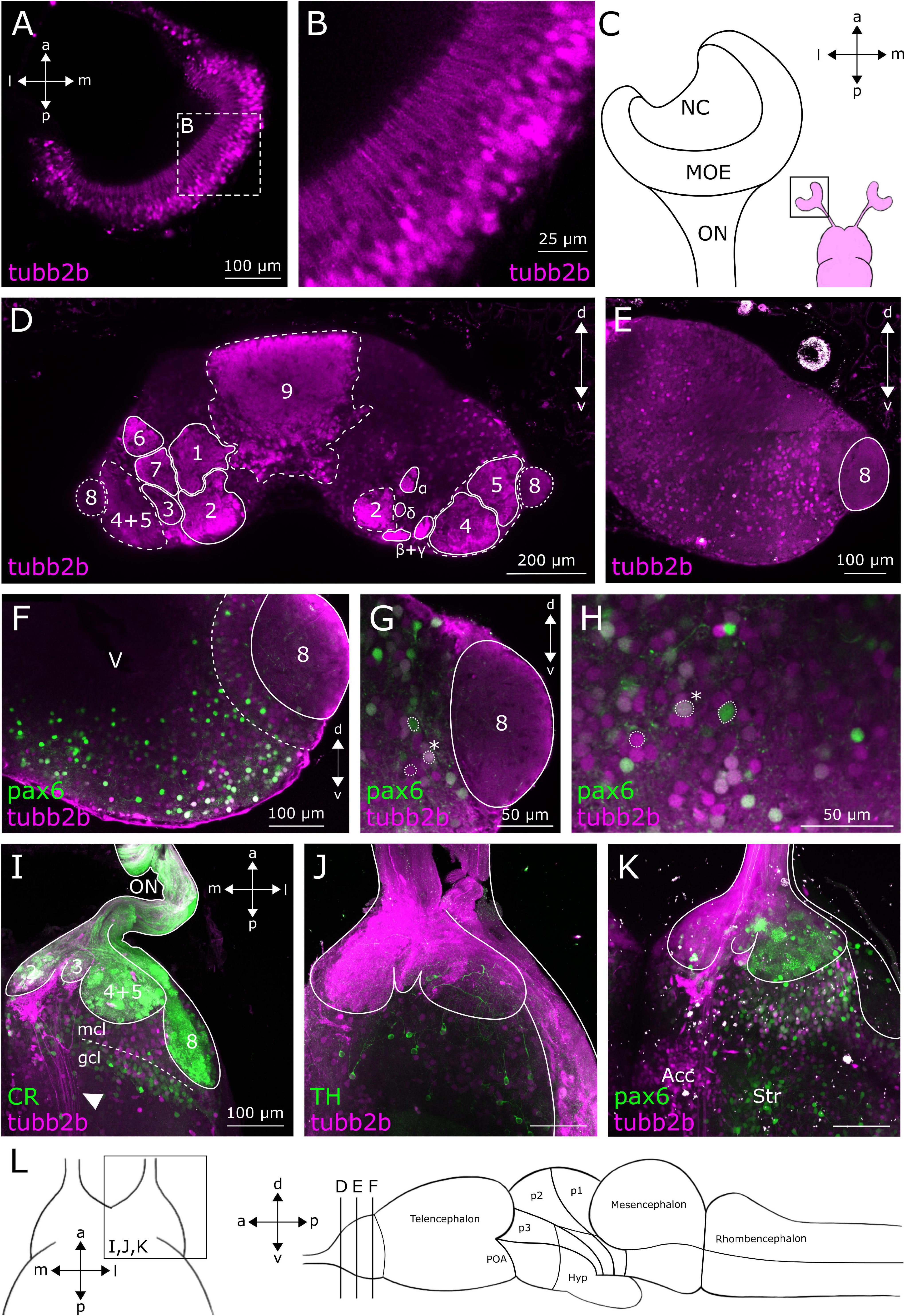 FIGURE 1. tubb2b-dependent fluorescence within the MOE and OB of larval Xenopus laevis. (A) Dorsal view of a single focal plane of the left main olfactory epithelium (MOE). tubb2b-dependent fluorescence (magenta) is present in olfactory receptor neurons. (B) Close-up of tubb2b-positive olfactory receptor neurons of the MOE. (C) Schematic overview of the olfactory organs (magenta). Close-up of the left MOE. (D) Coronal slice of the OB (left and right) of a transgenic NBT-Katushka γ-cry-Venus tadpole. tubb2b-dependent fluorescence (magenta) is present in axons of ORNs terminating in all known axonal projection fields of the OB (projection fields 1â9 and projection fields α, β, γ, and δ; see Gaudin and Gascuel, 2005). (E) Coronal slice of the OB (one side only) of transgenic NBT-Katushka γ-cry-Venus tadpoles and tubb2b-dependent fluorescence in cells of the mitral cell layer of the main and accessory (projection field 8) olfactory bulb. (FâH) Coronal slices of the OB (one side only) of transgenic NBT-Katushka pax6-GFP tadpoles. (F) tubb2b- (magenta) and pax6-dependent fluorescence (green) in cells in the mitral cell layer. (G,H) Close-ups of the mitral cell layer of the main and accessory OB showing tubb2b-dependent fluorescence and pax6-dependent fluorescence. Examples of cells featuring tubb2b-dependent fluorescence only and pax6-dependent fluorescence only, and double-fluorescent cells (*) are encircled. (IâK) Maximum projection of the whole ventral OB of one brain hemisphere. (I) tubb2b-dependent fluorescence has not been detected in calretinin (CR; green)-positive cells. tubb2b-positive fibers that bypass the OB were found in the intermediate OB (white arrow). (J) tubb2b-dependent fluorescence has not been detected in tyrosine hydroxylase (TH; green)-positive cells. (K) tubb2b-dependent fluorescence and pax6-dependent fluorescence have been detected in cells of the mitral cell layer. tubb2b-dependent fluorescence was also found in the nucleus accumbens (Acc) and pax6-dependent fluorescence in the anterior part of the striatum (Str). (L) Scheme of the larval brain showing the approximate positions (lines) of the sections shown in (AâL). POA, preoptic area; Hyp, hypothalamus; NC, nasal cavity; ON, olfactory nerve; mcl, mitral cell layer; gcl, granule cell layer; V, ventricle; d, dorsal; v, ventral; a, anterior; p, posterior; m, medial; l, lateral. |