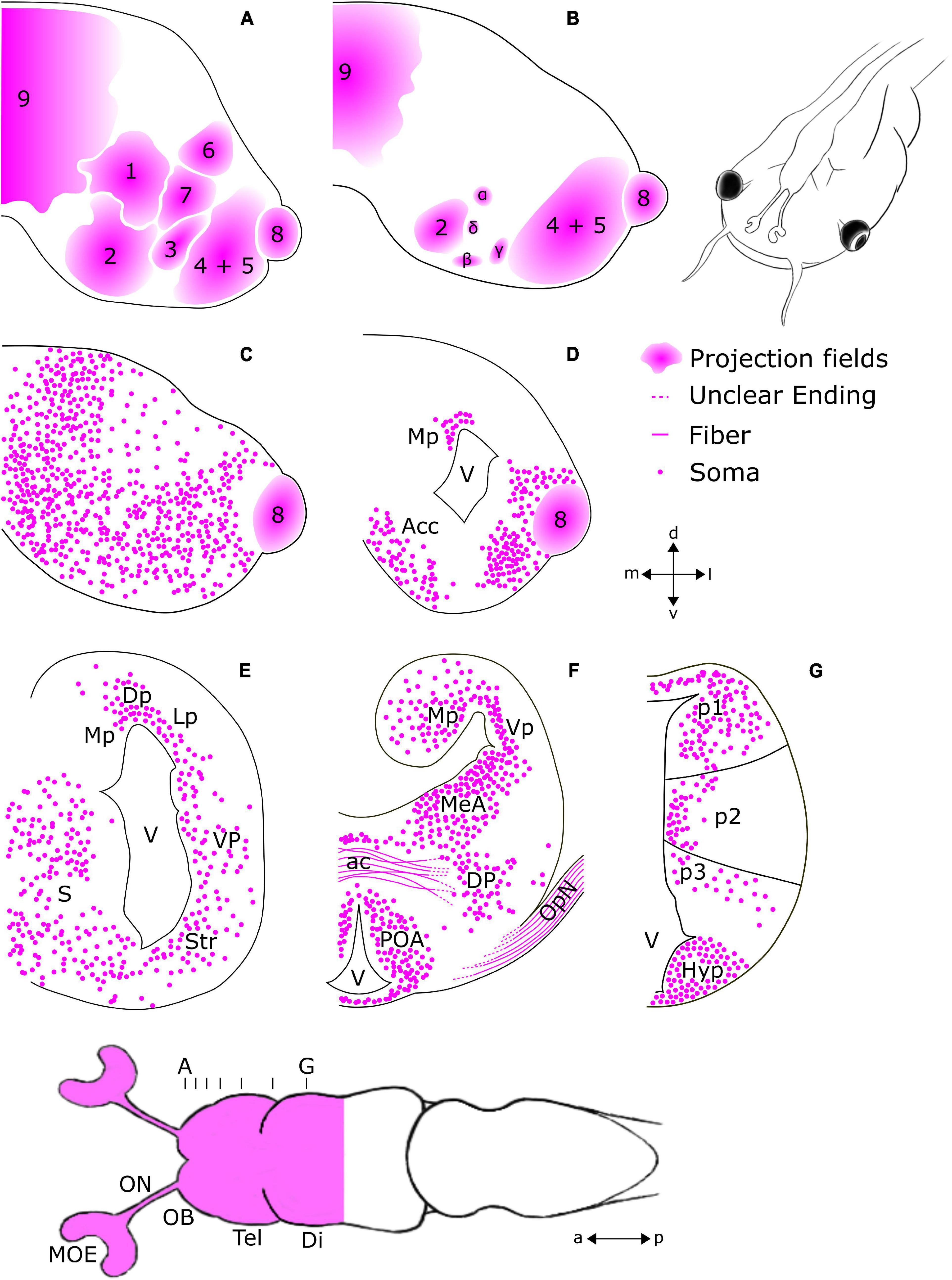 FIGURE 2. Schematic overview of regions featuring tubb2b-dependent fluorescence in the forebrain of premetamorphic Xenopus laevis. Ventral view of the larval forebrain and transverse sections of the olfactory bulb (OB; AâC), telencephalon (Tel; AâF), diencephalon (Di), and hypothalamus (G). The position and density of the cells shown for each region are presented based on observation and not via quantitative analysis. (A,B) tubb2b-dependent fluorescence is present in projection fields of axons arriving from the olfactory epithelium (1â9 + α, β, γ, δ; Gaudin and Gascuel, 2005). (C,D) tubb2b-dependent fluorescence in cells of the mitral cell layer of the main and accessory olfactory bulbs, the nucleus accumbens (Acc), and pallium. (E) tubb2b-dependent fluorescence in the medial pallium (Mp), lateral pallium (Lp), dorsal pallium (Dp), ventral pallium (Vp), striatum (Str), and septum (S). (F) tubb2b-dependent fluorescence in the anterior commissure (ac), medial amygdala (MeA), optic nerve (OpN), dorsal pallidum (DP), and preoptic area (POA). (G) tubb2b-dependent fluorescence in prosomeres 1â3 (p1â3). Hyp, Hypothalamus; lfb, lateral forebrain bundle; V, ventricle; MOE, main olfactory epithelium; ON, olfactory nerve; a, anterior; p, posterior; d, dorsal; v, ventral; l, lateral; m, medial. |