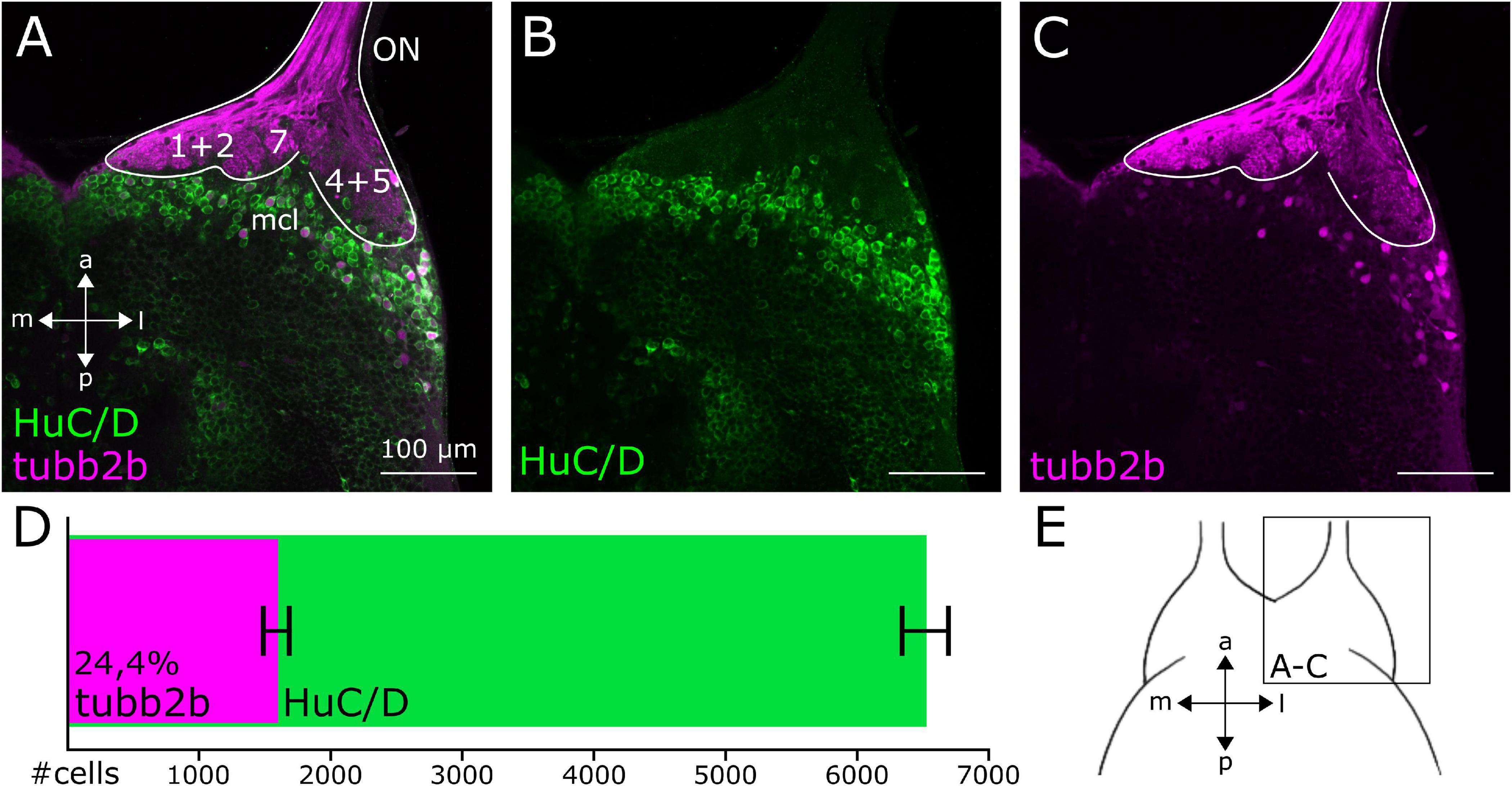 FIGURE 3. Cell density of tubb2b-positive neurons in the OB of premetamorphic Xenopus larvae. (AâC) Ventral view of a single focal plane of the OB of one brain hemisphere. (A) HuC/D-positive cells (green) are present throughout the whole OB. Few HuC/D-positive cells are also tubb2b-positive (magenta). (B) Pattern of HuC/D-positive cells within the OB. (C) tubb2b-positive cells are located in the mitral cell layer (mcl) of the OB. (D) Number of tubb2b-positive cells in comparison to HuC/D-positive cells of the whole OB. Average number of tubb2b-positive cells: 1,588 ± 191 (n = 10). Average number of HuC/D-positive cells: 6,517 ± 210 (n = 3). Cell density of tubb2b-positive cells compared to HuC/D-positive cells: 24,4%. (E) Scheme of the ventral OB showing the position of the images (AâC). ON, olfactory nerve; a, anterior; p, posterior; m, medial; l, lateral. |