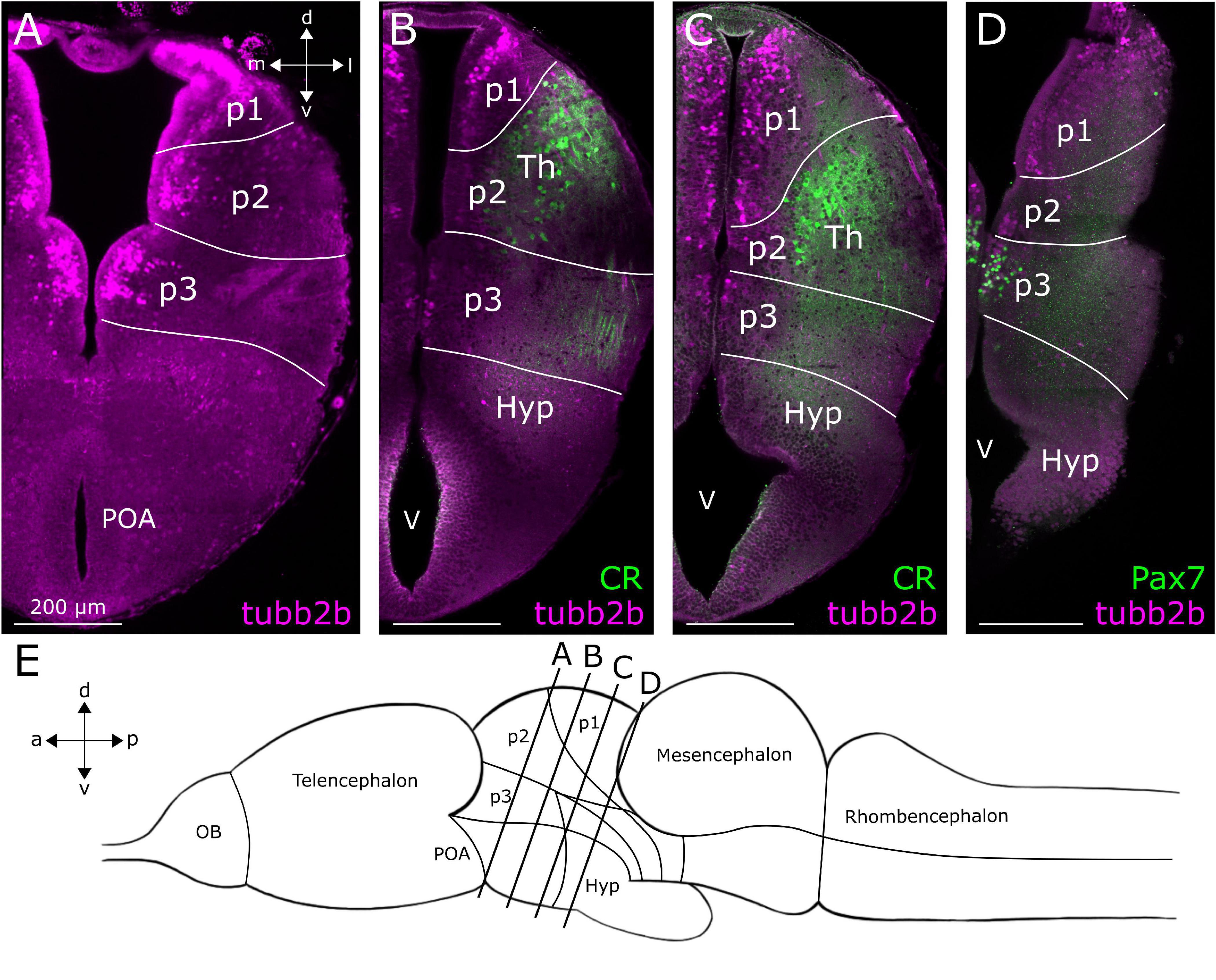 FIGURE 5. Location of tubb2b-dependent fluorescence in the diencephalon of larval Xenopus laevis. Coronal sections through the diencephalon of NBT-Katushka γ-cry-Venus transgenic tadpoles. (A) tubb2b-dependent fluorescence (magenta) in cells of prosomeres 1â3 (p1â3). (B) No tubb2b-dependent fluorescence could be detected in calretinin-positive cell bodies and fibers (CR; green) of the thalamus (Th). (C) tubb2b-dependent fluorescence-positive cell bodies in the area of the Th. CR-positive cells and fibers were not tubb2b-positive. (D) Cells in prosomere 3 (p3) did not show tubb2b-dependent fluorescence but could be stained with an antibody against Pax7 (green). (E) Approximate positions of the sliced regions are shown in a schematic image of the larval brain (lines). OB, olfactory bulb; Hyp, hypothalamus; POA, preoptic area; V, ventricle; d, dorsal; v, ventral; a, anterior; p, posterior; m, medial; l, lateral. |