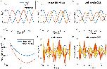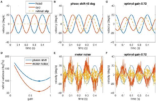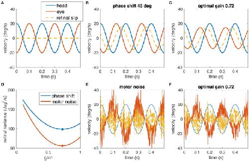 Figure 1. Simulated example of why decreasing the gain of the VOR can help minimizing the retinal image slip. (A) A perfect compensatory VOR (gain = 1, no phase shift, no noise) results in zero retinal image slip (eye velocity in red, head velocity in blue, retinal image slip in dashed yellow). (B) In the presence of a 45° phase shift between eye and head rotation, a strong retinal image slip is present despite a gain of 1. (C) Reducing the VOR gain to 0.72 minimizes the overall retinal image slip. (D) Variance of the retinal slip plotted with respect to the VOR gain for phase shifts as in (B,C) (blue), and noise as in (E,F) (red). The plots have been obtained from numerical simulations. The optimal gain in both cases is ~0.72 (red and blue dots). (E) Signal-dependent motor noise, proportional to eye velocity introduces a strong retinal image slip even if the gain = 1. (F) Reduction of the VOR gain also reduces the motor noise and thus the overall retinal image slip; retinal image slip plotted with respect to the VOR gain for this example is shown in (D) (red curve).