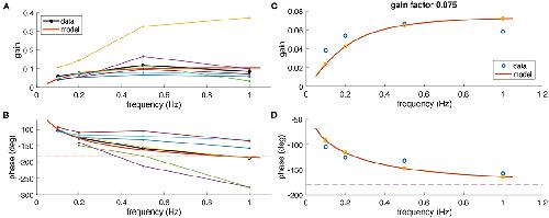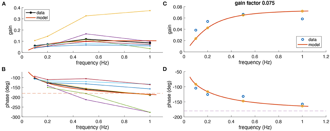 FIGURE 3. Comparison of experimental and modeling data. (A,B) Experimental gain (A) and phase values (B) for eye movements of Xenopus tadpoles (n = 6) (colored small dots) along with average gain and phase values (large black dots); the red curve depicts simulated gain and phase values obtained from the computational model (red line) of the tadpole aVOR that have been fitted to the average results (black); note that an eye movement with a phase shift of â180° [dashed line in (B)] and a gain of 1 would perfectly compensate for the head rotation at all frequencies. (C,D) Example experimental data (blue circles) obtained from one animal (same as in Figure 2) and modeling results (red curve, yellow circles), with gain and phase values plotted in (C,D), respectively.