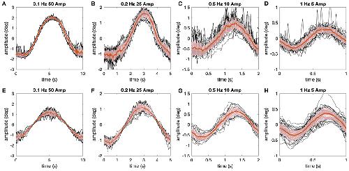FIGURE 5. Comparison of experimentally measured and simulated eye movements. (AâH) Eye movements (raw traces in black, red lines show average) shown for all stimulus motion cycles at different stimulus frequencies depicted for the representative animal in Figure 4 (AâD), along with corresponding simulations (EâH) of the data using the aVOR model (with appropriately adapted parameters) and optimal gain values to minimize the retinal image slip caused by signal-dependent sensor and motor noise (see also Figure 4); shaded areas indicate one standard deviation of the mean response.