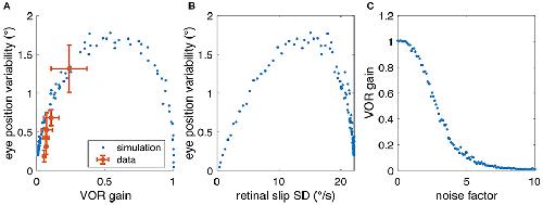 Figure 7. Relation between aVOR gain and variability of eye movements. (A) Replot of data from Figure 6C (red) together with model simulations of the standard aVOR model with varying sensorimotor noise and optimized aVOR gain (all other model parameters kept constant); the model predicts that for low aVOR gain values, the eye position variability will increase with increasing gain values (<0.5), but decrease again for higher values (>0.5). (B) Variability of eye movements for each animal plotted with respect to the retinal image slip [same simulations as in (B)]. (C) Optimal aVOR gain values [model simulations as in (A,B)] decreases with the sensorimotor noise factor.