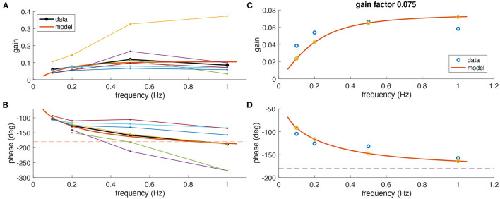 Figure 3. Comparison of experimental and modeling data. (A,B) Experimental gain (A) and phase values (B) for eye movements of Xenopus tadpoles (n = 6) (colored small dots) along with average gain and phase values (large black dots); the red curve depicts simulated gain and phase values obtained from the computational model (red line) of the tadpole aVOR that have been fitted to the average results (black); note that an eye movement with a phase shift of −180° [dashed line in (B)] and a gain of 1 would perfectly compensate for the head rotation at all frequencies. (C,D) Example experimental data (blue circles) obtained from one animal (same as in Figure 2) and modeling results (red curve, yellow circles), with gain and phase values plotted in (C,D), respectively.