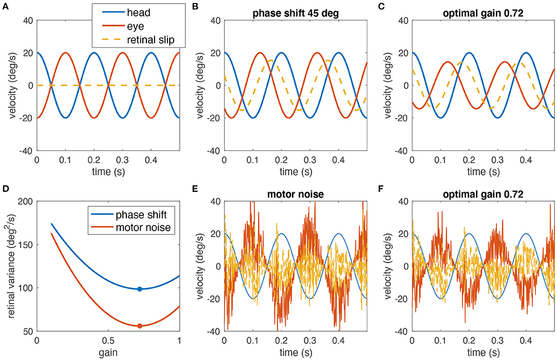 FIGURE 1. Simulated example of why decreasing the gain of the VOR can help minimizing the retinal image slip. (A) A perfect compensatory VOR (gain = 1, no phase shift, no noise) results in zero retinal image slip (eye velocity in red, head velocity in blue, retinal image slip in dashed yellow). (B) In the presence of a 45° phase shift between eye and head rotation, a strong retinal image slip is present despite a gain of 1. (C) Reducing the VOR gain to 0.72 minimizes the overall retinal image slip. (D) Variance of the retinal slip plotted with respect to the VOR gain for phase shifts as in (B,C) (blue), and noise as in (E,F) (red). The plots have been obtained from numerical simulations. The optimal gain in both cases is ~0.72 (red and blue dots). (E) Signal-dependent motor noise, proportional to eye velocity introduces a strong retinal image slip even if the gain = 1. (F) Reduction of the VOR gain also reduces the motor noise and thus the overall retinal image slip; retinal image slip plotted with respect to the VOR gain for this example is shown in (D) (red curve).