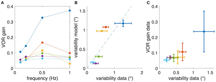 FIGURE 6. Relation between aVOR gain and variability of eye movements. (A) For comparison, aVOR gain values (see Figure 2) are shown for each animal separately in different colors. (B) Variability of eye movements for each animal plotted with respect to the predicted variability, i.e., the variability of the model simulations. (C) Variability of eye movements for each animal plotted with respect to the aVOR gain. Each data point in (B,C) represents the mean across four stimulus frequencies; error bars denote the standard deviation; note that for the animals depicted in yellow and orange only data for three frequencies were available.