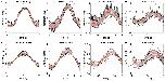 Figure 5. Comparison of experimentally measured and simulated eye movements. (A–H) Eye movements (raw traces in black, red lines show average) shown for all stimulus motion cycles at different stimulus frequencies depicted for the representative animal in Figure 4