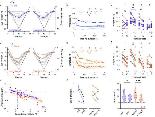 Fig. 2. Ontogeny of OKR plasticity. a–f Differential effects of prolonged visual image motion in old (a–c) and young (d–f) larvae; individual eye motion cycles (gray traces) and population average (colored traces, n = 7 (old, a), n = 8 (young, d) at the onset (left) and the end (right) of prolonged visual motion stimulation with profile 1 (velocity: 4°/s, cycle duration: 20 s; see 1 in Fig. 1c); population-averaged response amplitudes across 30 min of training (b, e), measured on a per-cycle basis for stimulus paradigms 1–4, respectively; mean response of five cycles (c, f) obtained immediately (I) and at the end of the 30-min OKR entrainment (E) on a per-animal basis for stimulus paradigms 1–4 (performed on different, independent sets of naïve tadpoles, respectively; see Fig. 1c). g Amplitude changes plotted against immediate OKR amplitudes for old (blue) and young (orange) tadpoles; solid lines indicate linear regression fit to data; shaded areas indicate 95% confidence interval of the fit; horizontal dotted line indicates no amplitude change; dots above indicate OKR amplitude increase, dots below OKR amplitude decrease; blue (old tadpoles) and orange (young tadpoles) vertical dashed arrows indicate the theoretical initial amplitudes, above or below which a decrease or increase is expected. h Standard deviation (SD) of the averaged response amplitudes immediately (I) and at the end of the entrainment period (E) for old and young tadpoles and stimulus paradigms 1–4 (for color-code see b, e). i Violin plots of immediate (I) and entrained response amplitudes (E), in young and old tadpoles respectively, pooled across stimulation paradigms 1–4