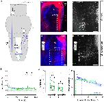 Fig. 3. Anatomical and functional consequences of climbing fiber transection. a Schematic of a Xenopus tadpole brain depicting the direct (black) and indirect (blue) OKR pathways for eliciting a horizontal OKR during rightward motion stimulation of the right eye; the site of climbing fiber transection in the caudal hindbrain is indicated by the green dashed line. b–e Whole-mount confocal reconstructions of the hindbrain (Hb) of a stage 55 control tadpole (b–c) and after midline transection (d–e) at the level of the caudal hindbrain (green line in a, scheme in d) counterstained with DAPI (blue nuclei); unilateral cerebellar injections of Tetramethylrhodamine (TMR; black arrows), outlined the climbing fiber (CF) axonal pathway (green arrow heads in c, e) and parent inferior olivary cell bodies in the contralateral ventral hindbrain in controls (b) and lack thereof after the lesion (* in d), illustrated at higher magnification in c, e (green dashed rectangles); f Population-averaged response amplitudes across 30 min of training, measured on a per-cycle basis for stimulus paradigms 3 and 4, in controls (blue) and after CF transection (green). g Mean response of five cycles obtained immediately (I) and at the end of the 30-min OKR entrainment (E) on a per-animal basis for stimulus paradigms 3 and 4 (see Fig. 1c) in CF-transected animals. h Amplitude changes plotted against immediate OKR amplitudes for controls (blue) and CF-transected animals (green); solid lines indicate linear regression fit to data, and shaded area the 95% confidence interval of the fit; horizontal dotted line indicates no amplitude change; dots above the line indicate amplitude increase, dots below amplitude decrease. Blue (control tadpoles) and green (CF-transected tadpoles) vertical dashed arrows indicate the theoretical initial amplitudes, above or below which a decrease or increase is expected. Abd abducens nucleus, Cb cerebellum, D dorsal, IO inferior olive, L lateral, MN motoneurons, Ocu oculomotor nucleus, Pt pretectum, R rostral, VN vestibular nuclei. Scale bars in all panels represent 100 µm