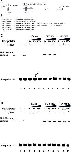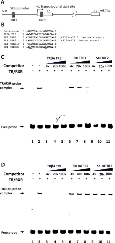 Fig. 3. TR binds to the putative TRE within the first exon of the Ski gene in vitro. (A) Schematic diagram of putative TREs in X. tropicalis Ski gene with the first (E1) and the last (E7) exons shown as clear boxes. (B) Sequences of the putative TREs in comparison with the sequences of consensus TRE and the TRE of Xenopus laevis TRβA gene (TRβA TRE). The numbers indicate the locations relative to the transcriptional start site of Ski gene (identified based on the 5′-end of cDNA sequence and denoted as + 1). Mutant versions of Ski TREs (Ski mTRE1/2, mutated nucleotides are underlined) were used for studies below. Bold letters indicate TRE half sites. E1: exon 1; E7: exon 7. (C)/(D) The putative Ski TRE2 compete efficiently against the TRβA TRE for binding to TR/RXR heterodimer in gel shift assay. The labeled double stranded TRβA TRE, used as the probe, was mixed with in vitro translated TR/RXR heterodimers in the presence or absence of 4x, 20x, or 100x of unlabeled wild type (C) or mutant (D) Ski TREs as indicated. The reaction mixtures were analyzed by Electrophoretic (or gel) Mobility Shift Assay (EMSA). The locations of TR/RXR bound probes (TR/RXR-probe complex) and unbound probes (Free probe) are indicated with arrows. Note that the labeled probe binding to the TR/RXR was competed away efficiently by the unlabeled TRβA TRE (C, lanes 3–5) and that Ski TRE2 also had strong competition (C, lanes 9–11) while Ski TRE1 had little competition (C, lanes 6–8). Neither one of the mutant Ski TREs had noticeable competition (D).