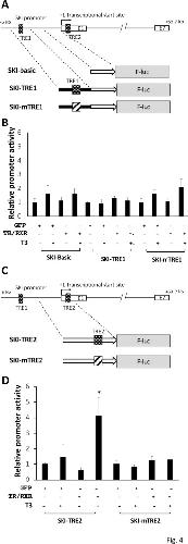 ???displayArticle.abstract??? Thyroid hormone (T3) is important for adult organ function and vertebrate development, particularly during the postembryonic period when many organs develop/mature into their adult forms. Amphibian metamorphosis is totally dependent on T3 and can be easily manipulated, thus offering a unique opportunity for studying how T3 controls postembryonic development in vertebrates. Numerous early studies have demonstrated that T3 affects frog metamorphosis through T3 receptor (TR)-mediated regulation of T3 response genes, where TR forms a heterodimer with RXR (9-cis retinoic acid receptor) and binds to T3 response elements (TREs) in T3 response genes to regulate their expression. We have previously identified many candidate direct T3 response genes in Xenopus tropicalis tadpoleintestine. Among them is the proto-oncogene Ski, which encodes a nuclear protein with complex function in regulating cell fate. We show here that Ski is upregulated in the intestine and tail of premetamorphic tadpoles upon T3 treatment and its expression peaks at stage 62, the climax of metamorphosis. We have further discovered a putative TRE in the first exon that can bind to TR/RXR in vitro and mediate T3 regulation of the promoter in vivo. These data demonstrate that Ski is activated by T3 through TR binding to a TRE in the first exon during Xenopus tropicalis metamorphosis, implicating a role of Ski in regulating cell fate during metamorphosis.