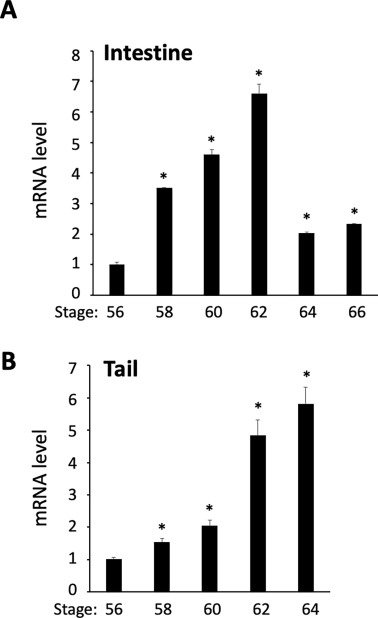 Fig. 1. Ski expression peaks at the climax of metamorphosis during natural frog metamorphosis. Genomic DNA-free total RNAs were extracted from the intestine and tail of X. tropicalis tadpoles at indicated stages and subjected to qRT-PCR analysis with primers specific for Ski as well as the control gene EF1α, respectively. Ski expression was normalized to that of EF1α and presented as mean + standard error of the mean (S.E.M), relative to the level at stage 56 in the organs, which was set to 1. Statistical analysis was done with ordinary-one-way ANOVA. *: p < 0.05.