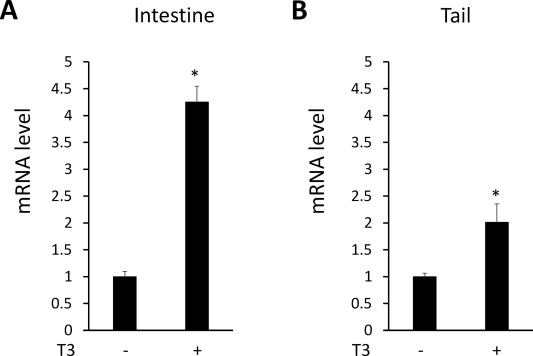 Fig. 2. Ski expression is upregulated by T3 in X. tropicalis tadpoles. Premetamorphic X. tropicalis tadpoles at stage 54 were treated with or without T3 for 2 days and subjected to total RNA extraction from the intestine and tail, respectively. cDNAs were made from the total RNAs and subjected to qRT-PCR analysis for Ski and EF1α expression, respectively. Ski expression was normalized to that of EF1α and presented as mean + standard error of the mean (S.E.M), relative to the level at stage 54 in the organs, which was set to 1. Student t-test was used to determine the significance of T3 regulation. *: p < 0.05.