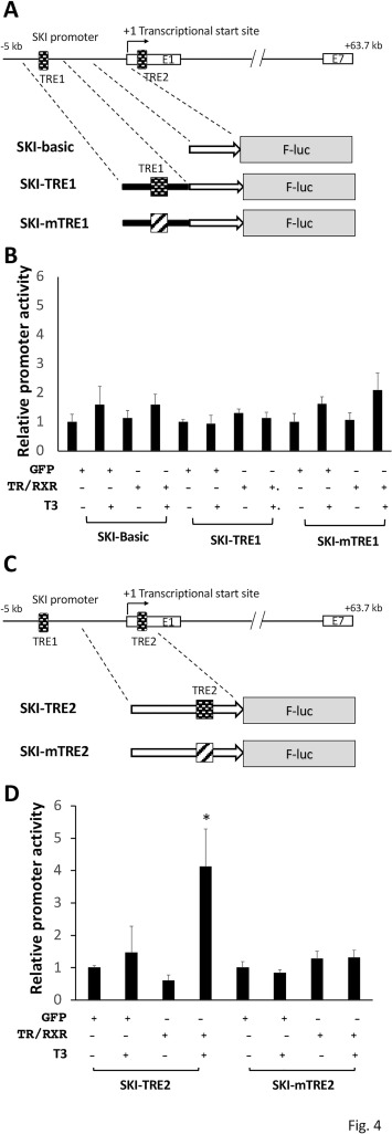 Fig. 4. The TRE2 but not TRE1 of X. tropicalis Ski gene mediates transcriptional regulation by T3 in vivo. (A) Schematic diagram of firefly luciferase reporter constructs containing the wild type putative Ski TRE1 (Ski-TRE1) or a mutant TRE1 (Ski-mTRE1) generated through PCR-mediated cloning to bring the putative Ski TRE1 or its mutant closer to the transcription start site (This was done because TREs located far from the start site do not activate the promoter effectively (Wong et al., 1997)). The Ski-basic has a truncated promoter region lacking the TRE1 or TRE2. (B) The Ski-TRE1 promoter is not activated by liganded TR in frog oocytes. The Ski-basic, Ski-TRE1 or Ski-mTRE1 promoter construct was co-injected with the control Renilla luciferase construct phRG-TK into the nucleus of Xenopus laevis oocytes with prior cytoplasmic injection of GFP mRNA or Xenopus tropicalis TRα and RXRβ mRNAs. The oocytes were incubated at 18 °C overnight in the absence or presence of 100 nM T3 and then lysed for dual luciferase assay. The relative activities of the firefly luciferase to Renilla luciferase were plotted as a measure of the reporter promoter activity. Error bars indicate S.E.M. Note that none of the reporters, including the one with wild type TRE1, was regulated by TR in the oocytes. (C) Schematic diagram of firefly luciferase reporter constructs containing the putative Ski TRE2 (Ski-TRE2) or a mutant TRE2 (Ski-mTRE2). (D) The Ski-TRE2 promoter is strongly activated by liganded TR in frog oocytes. The Ski-TRE2 or Ski-mTRE2 promoter construct was co-injected with the control Renilla luciferase construct phRG-TK into the nucleus of Xenopus laevis oocytes with prior cytoplasmic injection of GFP mRNA or Xenopus tropicalis TRα and RXRβ mRNAs. Oocytes were treated and analyzed as in (B). Error bars indicate S.E.M. Note that the wild type TRE2-containing reporter was activated by T3 only in the presence of TR/RXR and that the mutations in the Ski TRE2 abolished this activation. Statistical analysis was done with ordinary-one-way ANOVA. *: p < 0.05.