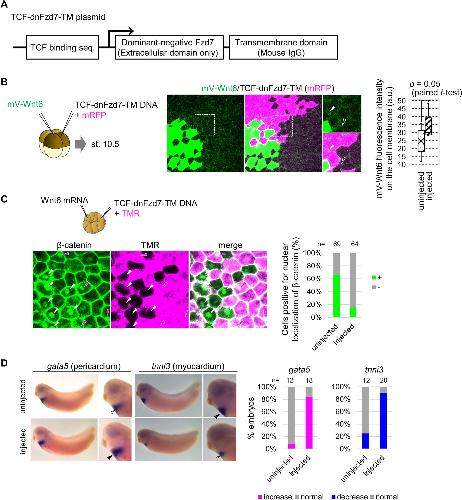 Figure 3-figure supplement 7. TCF-dnFzd7-TM accumulates Wnt6 protein but cell-autonomously inhibits Wnt signaling. (A) Schematic figure of the construct (TCF-dnFzd7-TM) inhibiting Fzd7 function in a Wnt-dependent manner. Luciferase sequence in TOPFlash plasmid was replaced with the sequence of dnFzd7, which is the extracellular domain of Fzd7, and mouse IgG transmembrane. (B) mV-Wnt6 mRNA and TCF-dnFzd7-TM plasmid (with mRFP mRNA) were injected into different blastomeres at the four-cell stage (as indicated in the left). mV-Wnt6 signal was high (arrowhead) on the cell membrane between cells with TCF-dnFzd7-TM plasmid injected (magenta), compared to that between intact cells (open arrowhead) as quantified in the graph. mVenus fluorescence intensity on the cell membrane was discretely measured on mRFP-positive cells (injected) and mRFP-negative cells (uninjected). Fluorescence intensities measured on neighboring cells were tested by paired t-test (n=5). The horizontal line indicates the median. Edges of boxes indicate the first and third quartiles. The cross indicates the mean, and whiskers indicate the minimum and maximum. These results indicate dnFzd7-TM can accumulate Wnt6 in a cell-autonomous manner. (C) Wnt6 mRNA and TCF-dnFzd7-TM plasmid (with a tracer, tetramethylrhodamine-dextran (TMR)) were injected into different blastomeres at the 16-cell stage. The hallmark of activated Wnt signaling, nuclear localization of β-catenin was reduced in the TCF-dnFzd7-TM injected cells magenta region, compared to the intact cells (non-magenta region) as quantified in the graph (Fisherâs exact test, p=2.7 x 10â9). Nuclear localizations of β-catenin are indicated by arrowheads (intact cells, white; dnFzd7-expressed cells, magenta). It should be noted that DNA injection generally induces mosaic expression, thus only some of the injected cells express dnFzd7-TM. (E) Injection of TCF-dnFzd7-TM induced gata5 expression (pericardium) and reduced tnni3 expression (myocardium) as quantified in the graph (Fisherâs exact test, p=1.4 x 10â5, 2.3 à 10â6, respectively). TCF-dnFzd7-TM was injected into two blastomere (prospective heart region) at the four-cell stage and fixed at st. 32. |