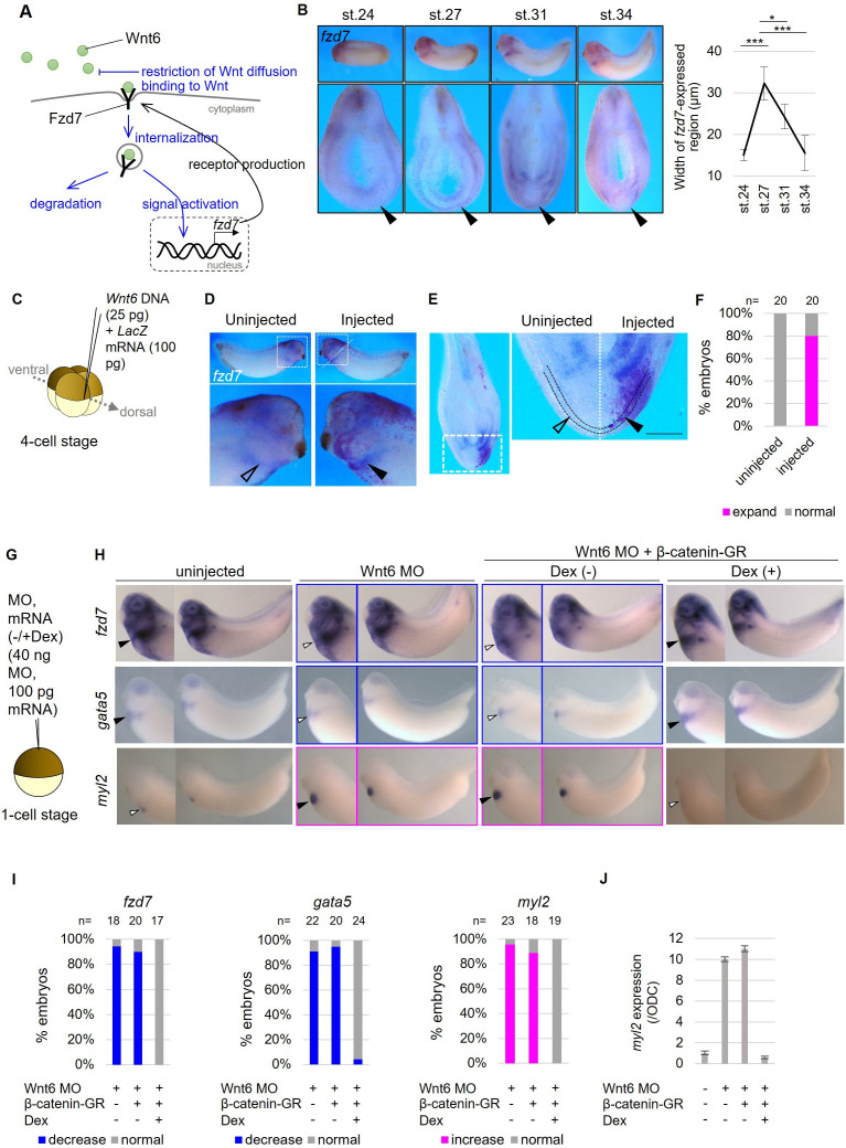 Figure 1—figure supplement 1. Wnt-dependent fzd7 expression and differentiation of the pericardium.(A) Schematic figure of Fzd7 receptor functions. Fzd7 binds to Wnt6. This binding itself restricts Wnt diffusion. In addition, Wnt-Fzd complex is internalized, and it decreases the amount of Wnt6 in the intercellular matrix, leading to restriction of Wnt distribution. Furthermore, Fzd7 activates Wnt signaling, resulting in the transcription of fzd7, forming a positive feedback loop to enhance the above restriction effects of Wnt distribution. (B) fzd7 expression during embryogenesis in Xenopus. fzd7-expressed region in prospective pericardium region is indicated by arrowheads and the width was quantified as shown in the graph. The expression was faintly observed at st. 24 and increased and expanded to st. 27. The expression was gradually decreased from st. 27 to st. 34. *, *** indicates p<0.05, 0.001, respectively (p=1.9 x 10–9, 1.9 × 10–2, 1.2 × 10–3, left to right in the graph; n=4 each). (C–F) Wnt6 DNA (25 pg) was injected into the marginal zone of one of dorsal blastomeres at the four-cell stage as indicated (C). LacZ mRNA was coinjected as a tracer in situ hybridization using fzd7 probe (D–E). The specimen was cut at the position of dashed line to make hemi-section (D). Around 80% of specimens showed expansion of fzd7 expression area in the injected side (arrowhead), which was not observed in the uninjected side (open arrowhead) (E, F; Fisher’s exact test, p=1.5 x 10–7). The pericardial region is the area between the dotted lines (E). Scale bar, 0.1 mm. (G–J) Wnt6 MO and β-catenin-GR mRNA were injected into the animal pole at the one-cell stage. β-catenin-GR was activated at the tailbud stage with Dex (the schematic view of β-catenin-GR/Dex function was shown in Figure 1C). (H–I) The pericardium region (fzd7/gata5-expressed region) was restricted by wnt6 knockdown as previously reported and it was rescued by β-catenin activation as quantified in I (Fisher’s exact test, p=9.4 x 10–3, 9.9 × 10–5, respectively). Myocardium region (myl2-expressed region) was expanded by Wnt inhibition as reported and it was rescued by β-catenin activation as quantified in I (Fisher’s exact test, p=2.5 x 10–4). This result was confirmed by qRT-PCR (J; normalized by an internal control, ODC (ornithine decarboxylase). Bars represent standard deviation). The picture of uninjected control of gata5 is the same for Figure 1D. |