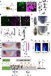Figure 4. Contributions of sFRP1 and heparan sulfate in Xenopus heart development. (A) sFRP1 did not accumulate on ndst1-expressing cells (open arrowhead), compared to intact cells (arrowhead). Indicated mRNAs were injected into different blastomeres at the four-cell stage. ndst1 was expressed in magenta-colored cells. mVenus fluorescence intensity on cell membranes is shown in the box plot. The horizontal line indicates the median. Edges of boxes indicate the first and third quartiles. The cross indicates the mean, and whiskers indicate the minimum and maximum. Scale bar, 30 μm. (B) sFRP1 was highly localized on N-acetyl-rich HS. mV-sFRP1 mRNA was injected into one blastomere at the four-cell stage. N-acetyl-rich HS was visualized with IHC. Signal intensity is quantified in C-D. Scale bar, 20 μm. (C) A typical result of a signal intensity measurement (between the two arrowheads in B) (green, mV-sFRP1; magenta, N-acetyl-rich HS). (D) Quantification of the colocalization between sFRP1 and N-acetyl-rich HS or N-sulfo-rich HS. A box plot of Pearsonâs r value, calculated from measurements, as in C (n=10 (N-acetyl-rich HS), 11 (N-sulfo-rich HS)), The p-value from Studentâs t-test is shown. (E) The distribution of N-acetyl-rich and N-sulfo-rich HS in heart tissue. IHC for N-acetyl-rich and N-sulfo-rich HS. The dotted line in the left figure shows the position of the magnified image on the right. N-acetyl-rich HS was highly localized in the outer region of cardiogenic mesoderm (prospective pericardium). Scale bar, 0.1 mm. (F) Heat-induced expression of ndst1 expanded tnni3 expression (myocardium). hsp::Ndst1 or hsp::EGFP (Figure 4âfigure supplement 2A) was injected into the prospective heart region at the four-cell stage, and heat shock (33°C, 15 min x 3 times) was induced at st. 24. In situ hybridization against tnni3 (cardiac troponin I) was performed at st. 32 as quantified in the graph (Fisherâs exact test, p=2.8 x 10â11). Scale bar, 0.5 mm. (G) Heatmap of Wnt signaling activity with/without sFRP1. The time change is shown as kymographs, in which time advances from top to bottom. The dotted line (white, no sFRP1; magenta, with sFRP1) shows an example of the threshold in Wnt signaling activity. The line became nearly vertical faster with sFRP1 (the change of the contour by addition of sFRP1 is indicated by a white arrow). These figures correspond to parts of Figure 3âfigure supplement 4 (âthe initial amount of receptorâ = ânormalâ, âthe strength of feedbackâ = ânormalâ). (H) Schematic view of Wnt signaling in heart tissue. Wnt ligand is secreted from the epidermis (left cells). Before the onset of Wnt6 expression, the receptor (Fzd7) is broadly expressed around the prospective pericardium region. Wnt signaling is activated in a concentration-dependent manner (circular arrows), which induces Fzd7 expression and restricts Wnt ligand spreading. sFRP1 is secreted from the prospective myocardium region. This sFRP1 expression is inhibited by Wnt signaling. sFRP1 protein distribution is restricted by N-acetyl HS, which is abundant in the outer region of cardiogenic mesoderm. |