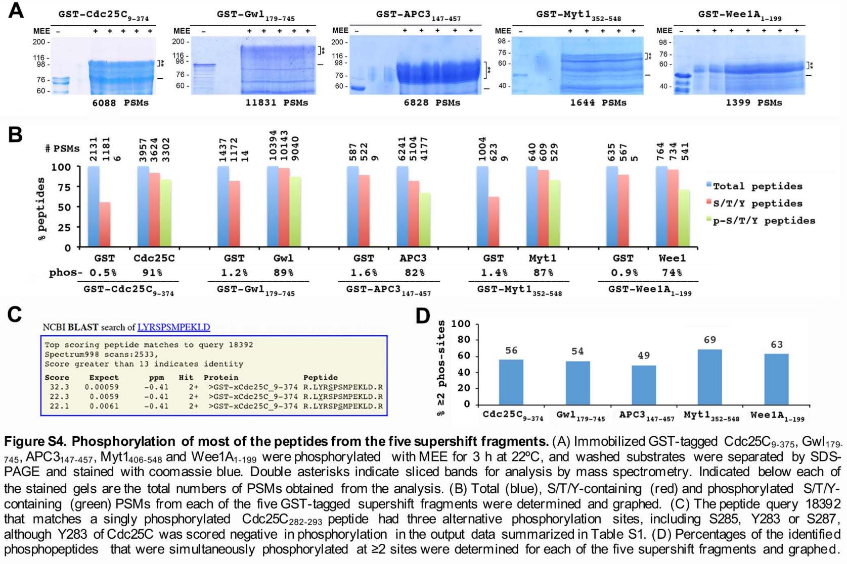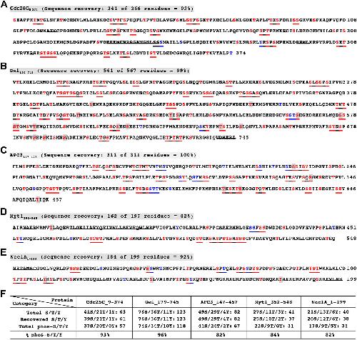 FIGURE 4: Significant phosphorylation of most of the S/T or S/T/Y residues in the supershift domain. (AâE) Phosphorylation sites identified in the supershift fragments of Cdc25C (A), Gwl (B), APC3 (C), Myt1 (D), and Wee1A (E). Strikethroughs indicate nonrecovered sequences. Red and blue types indicate phosphorylated and nonphosphorylated S/T/Y residues determined by mass spectrometry, respectively. Underlines are S/T/Y clusters. Shaded S/T/Y residues in red types indicate <5% of phosphorylation identification frequencies. (F) A summary of recovered S/T/Y residues and identified phosphorylation sites from the five supershift fragments. |