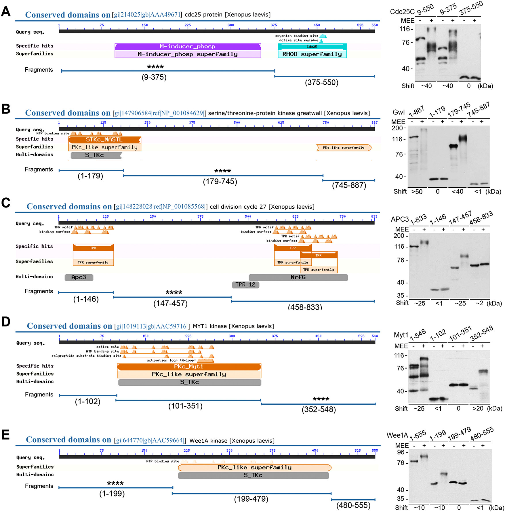 FIGURE 2: Association of the M-phase supershift with specific protein regions. Cdc25C (A), Gwl (B), APC3 (C), Myt1 (D), and Wee1A (E) were each divided into indicated fragments according to their functional domains from NCBI search, with indication of the supershift fragments identified by four asterisks (left). Indicated myc-tagged full-length and fragment proteins were phosphorylated with MEE for 2 h, followed by myc-tag immunoblotting (right). Estimated magnitudes of the MEE-induced gel mobility shifts for different proteins are indicated. |