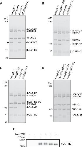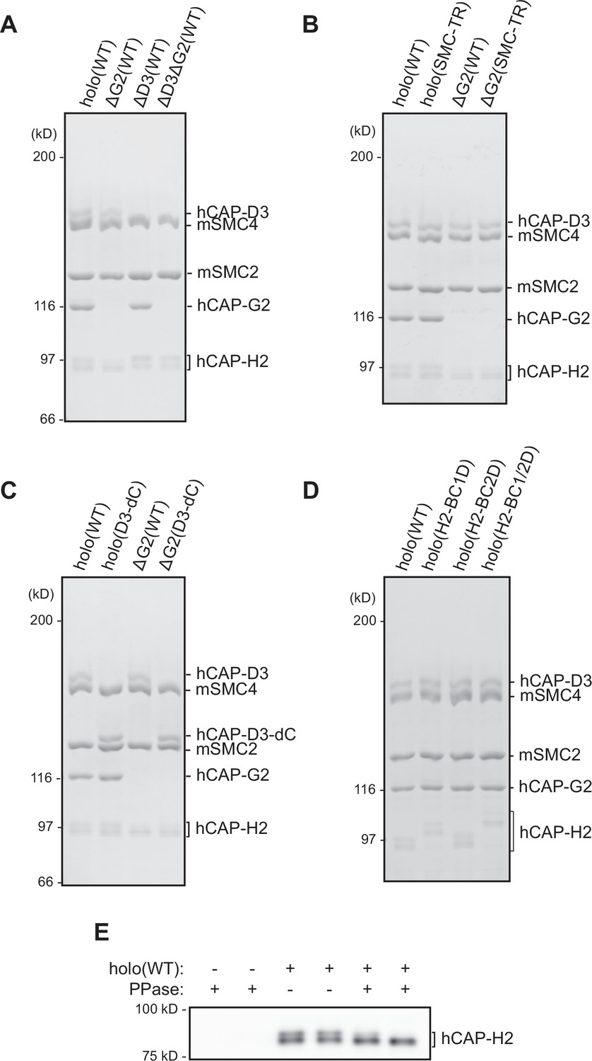 Figure 1—figure supplement 1. Recombinant condensin II complexes used in the study. (A) Recombinant condensin II holocomplex (holo[WT]), ΔG2(WT), ΔD3(WT), and ΔD3ΔG2(WT) were purified and subjected to SDS-PAGE. The gel was stained with Coomassie Brilliant Blue (CBB). (B) Recombinant condensin II holocomplexes and ΔG2 subcomplexes containing either wild-type (WT) or transition state (TR) mutant version of the structural maintenance of chromosomes (SMC) subunits. (C) Recombinant condensin II holocomplexes and ΔG2 subcomplexes containing either WT or C-tail truncated version (D3–dC) of the CAP-D3 subunit. (D) Recombinant condensin II holocomplexes containing either WT, a single set of basic cluster mutations (H2-BC1D or H2-BC2D), or both sets of basic cluster mutations (H2-BC1/2D) of the CAP-H2 subunit. (E) Recombinant condensin II holo(WT) was incubated with or without λ protein phosphatase (PPase) for 60 min and subjected to immunoblotting. hCAP-H2 migrated as two bands without phosphatase treatment but migrated as a single band after protein phosphatase treatment, indicating that a fraction of hCAP-H2 is phosphorylated when expressed in insect cells. |