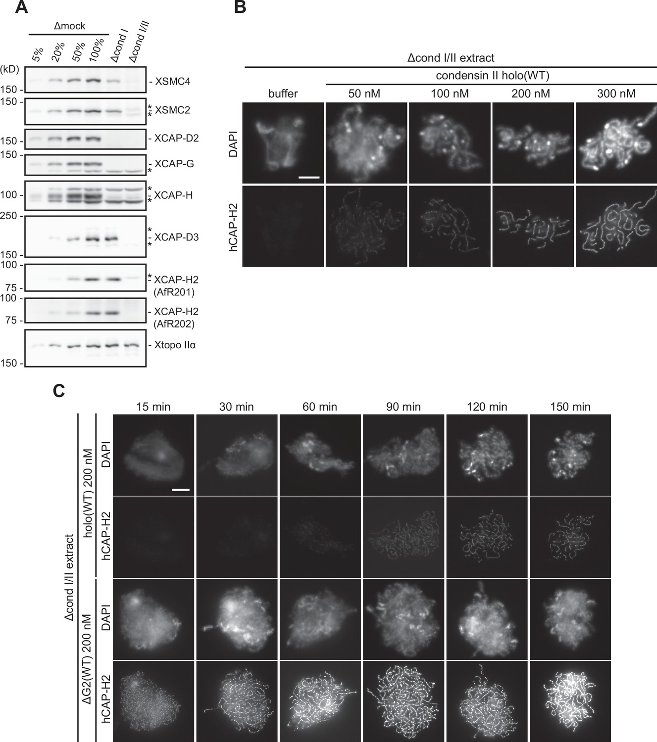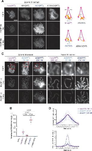 Figure 2—figure supplement 1. Immunodepletion of endogenous condensin complexes and basic characterization of recombinant condensin II complexes in Xenopus egg extracts. (A) Xenopus egg extracts were immunodepleted with control IgG (Δmock), antibodies against endogenous condensin I subunit (Δcond I extract), or antibodies against both endogenous condensin I and II subunits (Δcond I/II extract). An aliquot of each immunodepleted extract was analyzed by immunoblotting with antibodies to estimate the efficiency of immunodepletion with decreasing amounts of Δmock extract (100, 50, 20, and 5%). Xenopus topoisomerase IIα (Xtopo IIα) acts as a loading control. Asterisks (*) indicate non-specific bands. Immunodepletion of Xenopus CAP-H2 (XCAP-H2) was evaluated with two different affinity-purified antibodies (AfR201 and AfR202) raised against the same antigen to confirm that the band migrating slightly slower than XCAP-H2 is a non-specific band cross-reacted only with AfR201 but not with AfR202. (B) Mouse sperm nuclei were incubated in Δcond I/II extracts supplemented with control buffer (buffer) or holo(WT) at increasing concentrations from 50 nM to 300 nM. After 150 min, reaction mixtures were fixed, labeled with anti-hCAP-H2 antibody, and stained by DAPI. Shown here is a representative image from over 15 chromosome clusters examined per condition. The change in chromosomal morphology from cloud to chenille-like chromosomes by recombinant mammalian condensin II holo(WT) is concentration-dependent. Scale bar, 10 µm. (C) Mouse sperm nuclei were incubated in Δcond I/II extracts supplemented with control buffer (buffer), holo(WT) at 200 nM or ΔG2(WT) at 200 nM. Reaction mixtures were fixed at 0, 15, 30, 60, 90, 120, and 150 min, and labeled with anti-hCAP-H2 antibody. DNA was counterstained by DAPI. Shown here is a representative image from over 15 chromosome clusters examined per condition. ΔG2(WT) accumulates on chromatin and induces its structural changes at much earlier time points than holo(WT). Scale bar, 10 µm. WT: wild-type. |