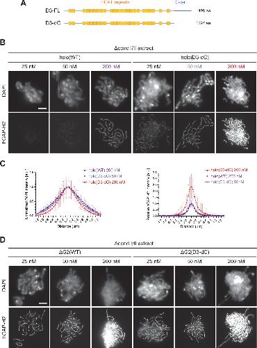 Figure 4. The CAP-D3 C-tail negatively regulates condensin II-mediated chromosome assembly. (A) A schematic diagram of the full-length hCAP-D3 (D3–FL) and hCAP-D3 lacking the C-terminal tail (D3–dC). (B) Mouse sperm nuclei were incubated in Δcond I/II extracts that had been supplemented with condensin II holo(WT) or holo(D3-dC) at either 25, 50, or 200 nM. After 150 min, reaction mixtures were fixed and labeled with anti-hCAP-H2 antibody. DNA was counterstained with DAPI. Shown here is a representative image from over 15 chromosome clusters examined per condition. Scale bar, 10 µm. (C) DAPI and hCAP-H2 intensities from the experiment described in (B) were measured along lines drawn perpendicular to chromosome axes to create line scan profiles for the width of chromosomes assembled in Δcond I/II extract with 200 nM holo(WT) or either 50 nM or 200 nM holo(D3-dC) (n=20 chromosomes). The mean and SD were normalized individually to the DAPI intensities (arbitrary unit [a.u.]) at the center of chromosome axes (distance = 0 μm) within each set. Intensities of hCAP-H2 were normalized relative to the central value by 200 nM holo(WT) addition. A dataset from a single representative experiment out of three repeats is shown. (D) Mouse sperm nuclei were incubated in Δcond I/II extracts that had been supplemented with condensin II ΔG2(WT) or ΔG2(D3-dC) at either 25, 50, or 200 nM in the same experiment as (B). After 150 min, reaction mixtures were fixed and labeled with anti-hCAP-H2 antibody. DNA was counterstained with DAPI. Shown here is a representative image from over 15 chromosome clusters examined per condition. Scale bar, 10 µm. WT: wild-type. |