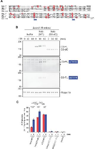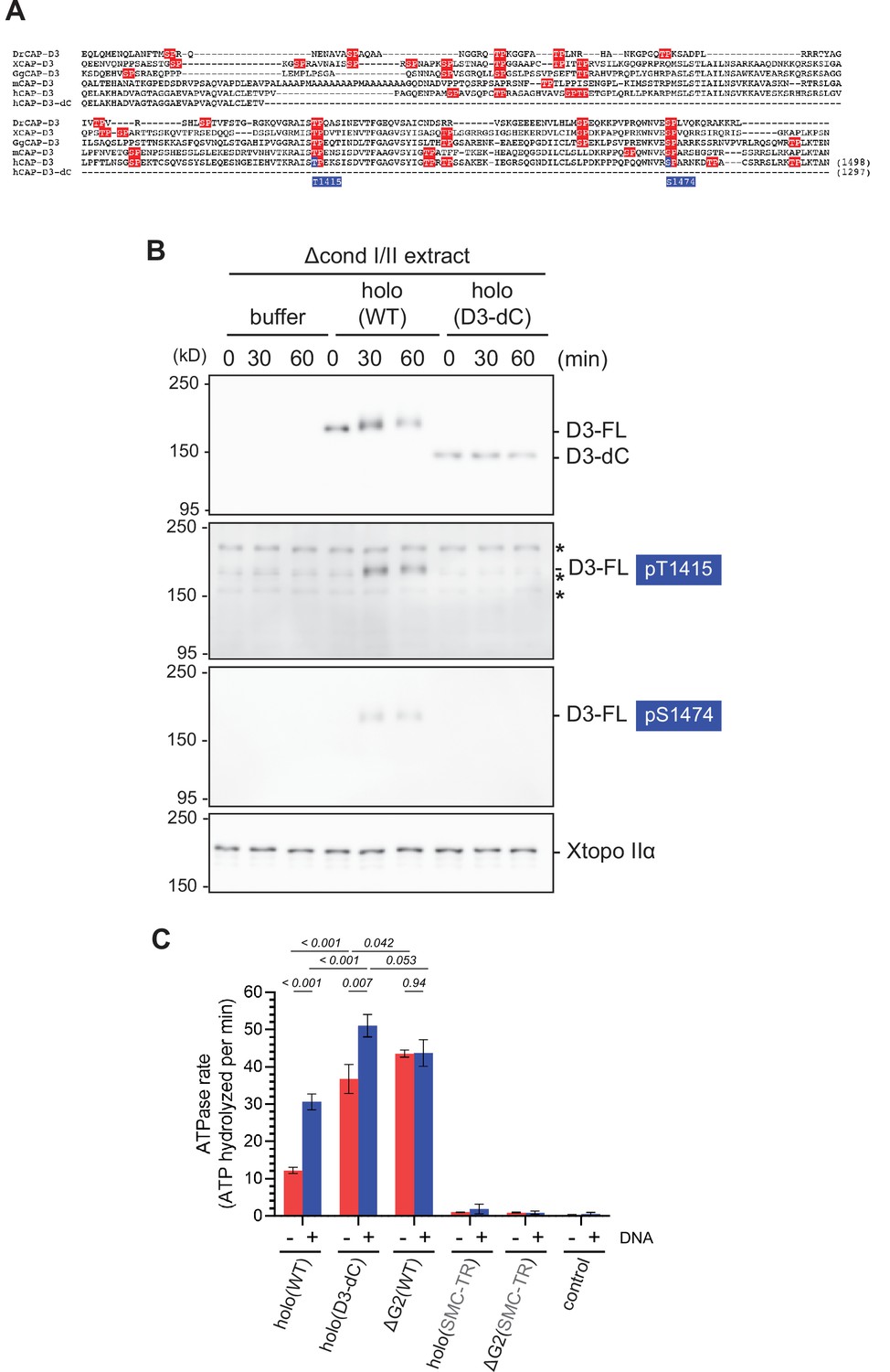 Figure 4—figure supplement 1. Additional characterization of deletion of the CAP-D3 C-tail. (A) Sequence alignment of the C-tail of the CAP-D3 orthologs from Danio rerio (DrCAP-D3), Xenopus laevis (XCAP-D3), Gallus (GgCAP-D3), Mus musculus (mCAP-D3) and human (hCAP-D3). Note that hCAP-D3-dC lacks the C-tail containing multiple potential CDK1 phosphorylation consensus sites (red), which include T1415 and S1474 (blue). (B) Xenopus egg extracts were immunodepleted with antibodies against both endogenous condensin I and II subunits (Δcond I/II extract). The extracts were supplemented with control buffer (buffer), holo(WT), or holo(D3-dC) without sperm nuclei. Aliquots were taken at the indicated time points and subjected to immunoblotting with the indicated antibodies, including anti-phospho-specific antibodies against hCAP-D3 pT1415 and pS1474. Xenopus topoisomerase IIα (Xtopo IIα) was used as a loading control. Asterisks (*) indicate non-specific bands. Note that full-length hCAP-D3 (D3–FL) migrated slower as incubation time increased, which is accompanied by phosphorylation at T1415 and S1474. In contrast, CAP-D3 lacking the C-tail (D3–dC) did not change in its mobility upon incubation. (C) ATPase rate of holo(D3-dC) was compared with that of holo(WT) and other mutant complexes in the absence or presence of double-stranded DNA (dsDNA). The error bar represents the SD from three repeats. The p-values listed were assessed by two-tailed t-test. Note that part of the data derived from the same set of experiments was shown in Figure 3C. |