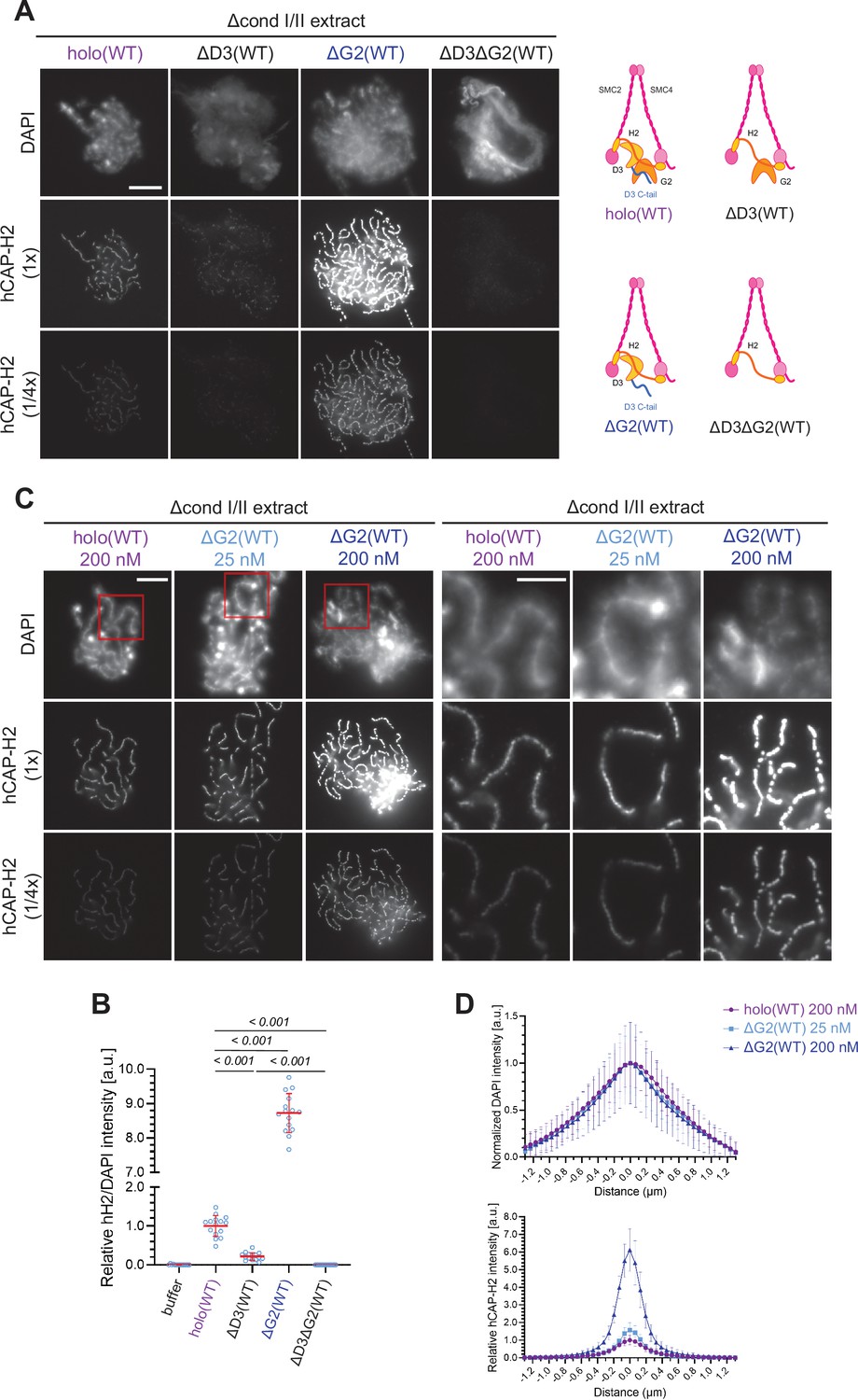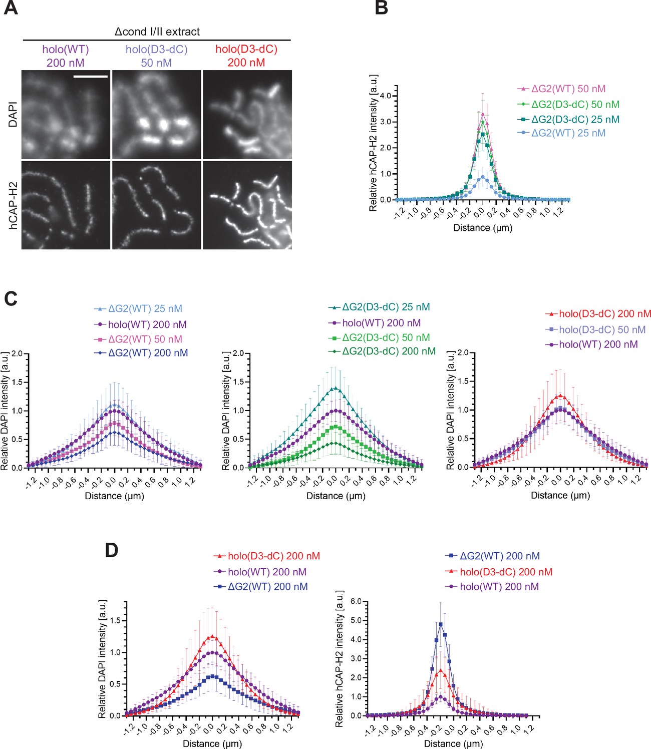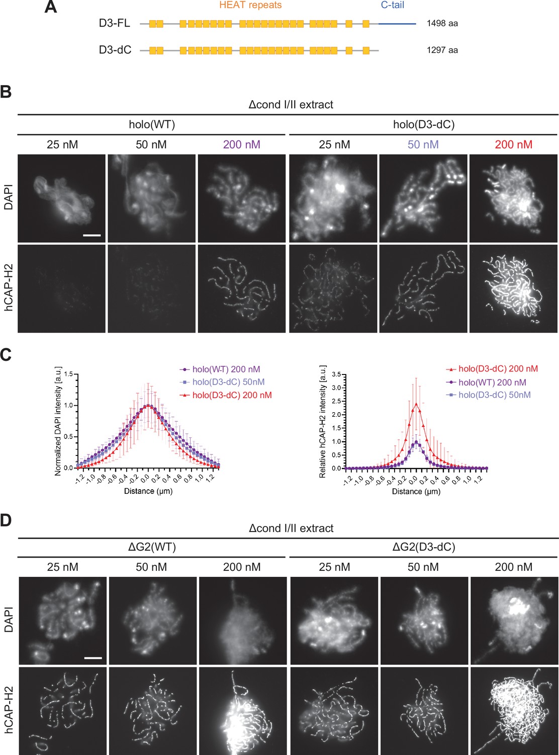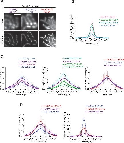 Figure 4—figure supplement 2. Additional profiles of chromosomes assembled by holo(WT), holo(D3-dC), ΔG2(WT), and ΔG2(D3-dC) from the experiment described in Figure 4. (A) Chromosomes assembled by holo(WT), holo(D3-dC), and holo(D3-dC) added at the concentrations indicated. Shown here are blowups of part of the images presented in Figure 4B. Scale bar, 5 µm. (B) to (D) Chromosomes were assembled in Δcond I/II extract that had been supplemented with holo(WT), holo(D3-dC), ΔG2(WT), or ΔG2(D3-dC) at three different concentrations as described in Figure 4B and D. DAPI and hCAP-H2 intensities were measured along lines drawn perpendicular to chromosome axes to create line scan profiles for the width of chromosomes. The dataset shown is from the same single representative experiment as Figure 4C out of three repeats (n=20 chromosomes). The mean and SD were normalized relative to the DAPI and hCAP-H2 intensities (arbitrary unit [a.u.]) at the center of chromosome axes (distance = 0 μm) formed by 200 nM holo(WT) addition. (B) Profiles of hCAP-H2 intensities for ΔG2(WT) and ΔG2(D3-dC) added at concentrations of 25 nM and 50 nM were compared. (C) Profiles of DAPI intensities for ΔG2(WT), ΔG2(D3-dC), and holo(D3-dC) added at different concentrations were compared to the profile for holo(WT) added at 200 nM. Note that DAPI intensities at the axial region decreased in a dose-dependent manner in the cases of ΔG2(WT) and ΔG2(D3-dC) addition, whereas they increase in the case of holo(D3-dC) addition. (D) Profiles of DAPI and hCAP-H2 intensities for holo(WT), holo(D3-dC), and ΔG2(WT) added at 200 nM were compared. WT: wild-type. |