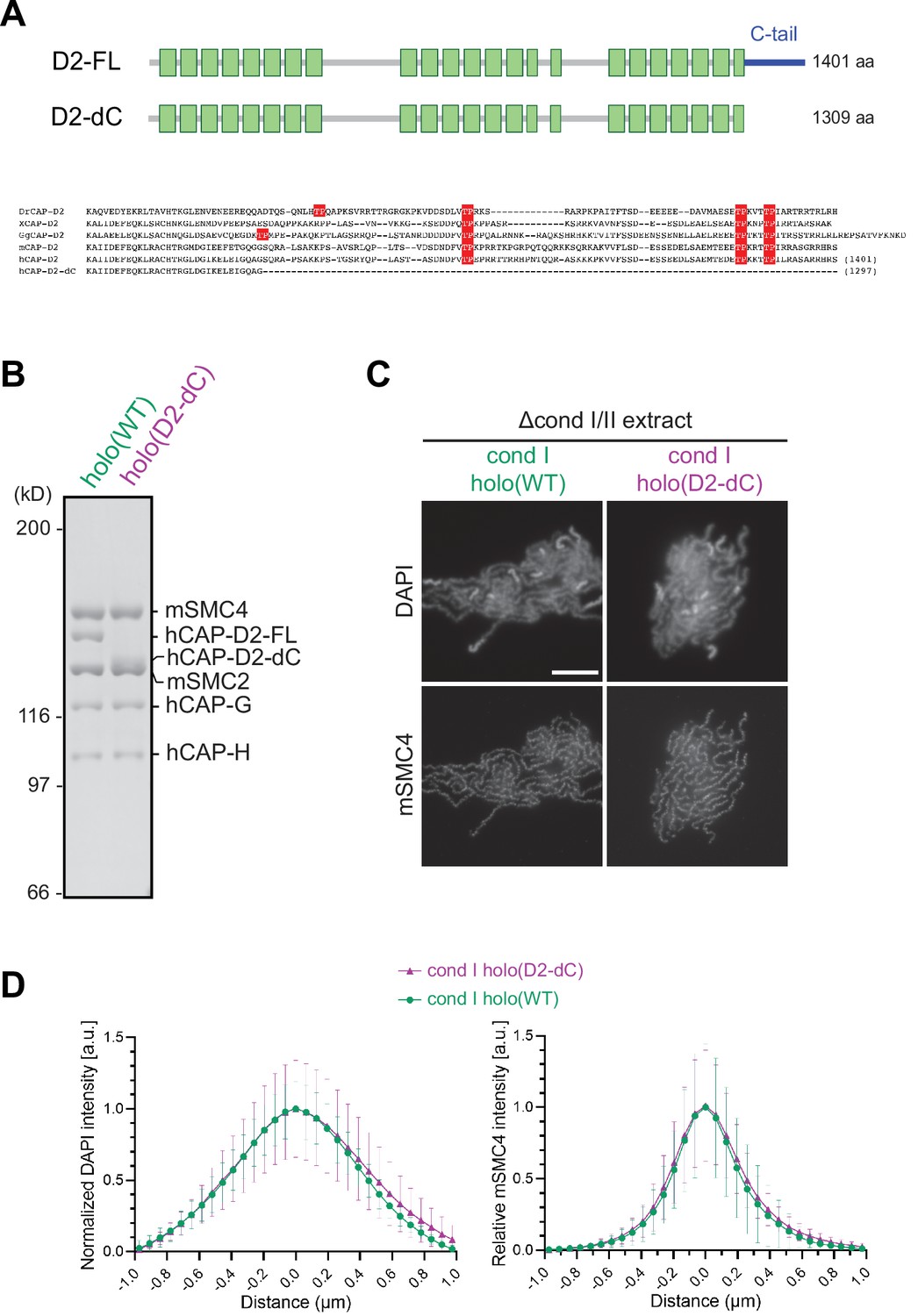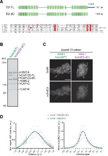 Figure 4—figure supplement 3. Deletion of the CAP-D2 C-tail in condensin I has little impact on chromosome assembly in Xenopus egg extracts. (A) A schematic diagram of the full-length hCAP-D2 (D2–FL) and hCAP-D2 lacking the C-terminal tail (D2–dC). (B) Recombinant condensin I holocomplexes containing either wild-type (WT) or C-tail truncated (D2–dC) version of hCAP-D2 were purified and subjected to SDS-PAGE. The gel was stained with Coomassie Brilliant Blue. (C) Mouse sperm nuclei were incubated in Δcond I/II extracts that had been supplemented with recombinant condensin I holo(WT) or holo(D2-dC) at 35 nM. After 150 min, reaction mixtures were fixed and labeled with anti-mSMC4 antibody. DNA was counterstained with DAPI. Shown here is a representative image from over 15 chromosome clusters examined per condition. Scale bar, 10 µm. (D) DAPI and mSMC4 intensities from the experiment described in (C) were measured along lines drawn perpendicular to chromosome axes to create line scan profiles for the width of chromosomes assembled in Δcond I/II extract with either recombinant condensin I holo(WT) or holo(D2-dC) at 35 nM (n=20 chromosomes). The mean and SD were normalized individually to the DAPI intensities (arbitrary unit [a.u.]) at the center of chromosome axes (distance = 0 μm) within each set. Intensities of mSMC4 were normalized relative to the central value by 35 nM condensin I holo(WT) addition. Deletion of the CAP-D2 C-tail showed little effect on the accumulation of condensin I on the axis and on the rod-shaped chromosome morphology compared to those by holo(WT). SMC, structural maintenance of chromosomes; WT: wild-type. |