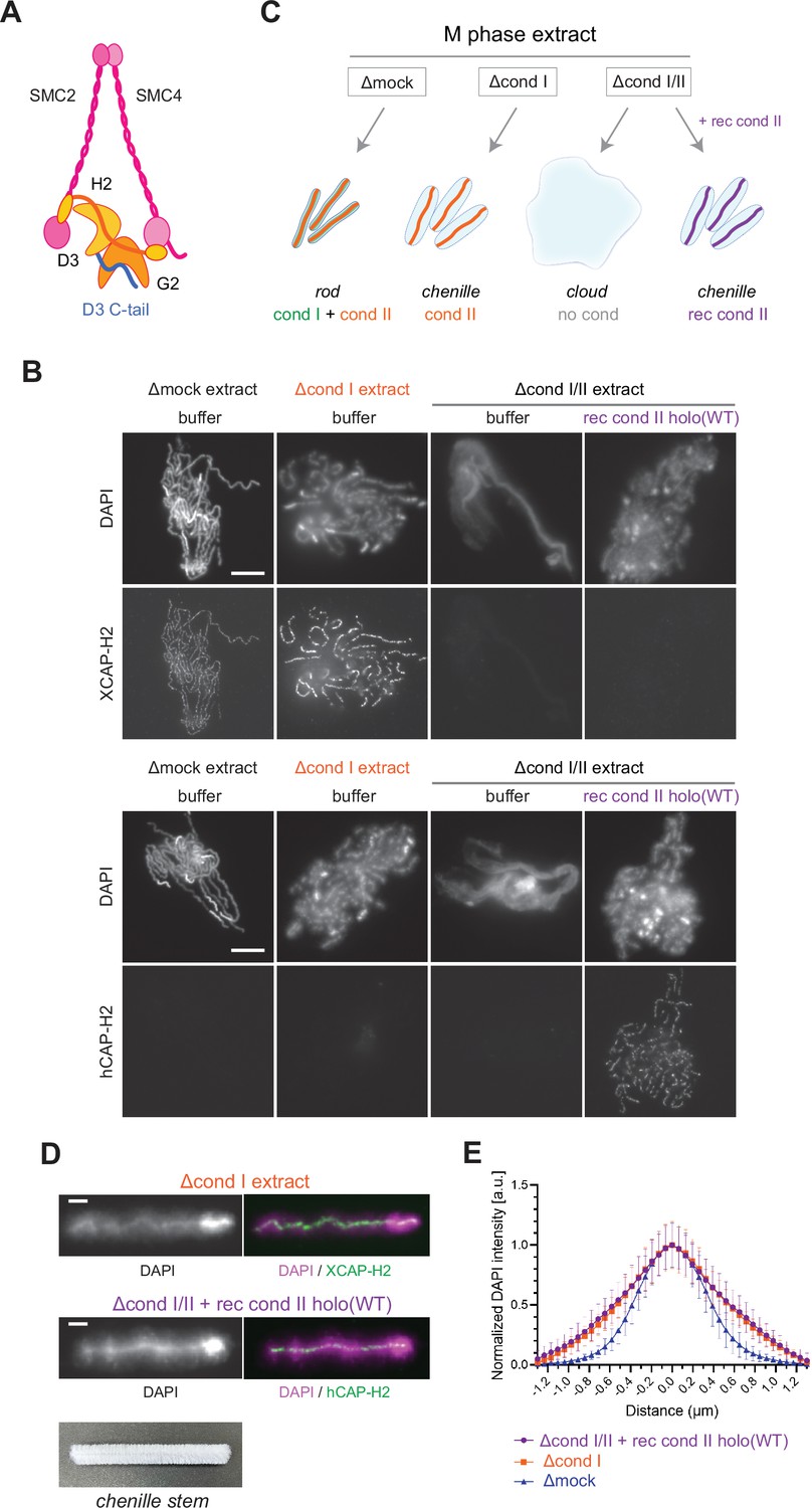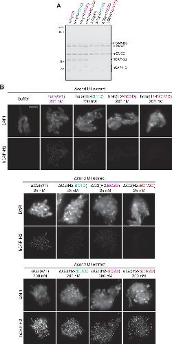 Figure 1. Recombinant condensin II holocomplex can functionally replace endogenous condensin II in Xenopus egg extracts. (A) A schematic diagram of the condensin II holocomplex that is composed of two structural maintenance of chromosomes (SMC) subunits (SMC2 and SMC4), two HEAT subunits (CAP-D3 and CAP-G2), and a kleisin subunit (CAP-H2). (B) Mouse sperm nuclei were incubated with Δmock, Δcond I, or Δcond I/II extracts that had been supplemented with a control buffer (buffer) or recombinant (rec) condensin II holocomplex, holo(WT), at a final concentration of 200 nM. After 150 min, reaction mixtures were fixed, split, and labeled with an antibody against either Xenopus CAP-H2 (XCAP-H2) or human CAP-H2 (hCAP-H2). DNA was counterstained with DAPI (4′,6-diamidino-2-phenylindole). Shown here is a representative image from over 15 chromosome clusters examined per condition. Scale bar, 10 µm. (C) A schematic representation of the chromosome structures observed in Δmock, Δcond I, or Δcond I/II extracts. Rod-shaped chromosomes and chenille-like chromosomes are assembled in Δmock extract and Δcond I extract, respectively. Δcond I/II extract produces an amorphous mass of chromatin (‘clouds’). The addition of recombinant condensin II (rec cond II) to the same extract restores its ability to assemble chenille-like chromosomes. (D) A single chromosome assembled in Δcond I extract with buffer and Δcond I/II extract with 200 nM holo(WT) from samples from experiment (B) in comparison to a chenille stem. Scale bars for chromosomes, 2 µm. (E) DAPI intensities from the experiment described in (B) were measured along lines drawn perpendicular to chromosome axes to create line scan profiles for the width of chromosomes assembled in the Δcond I extract with buffer and Δcond I/II extract with 200 nM holo(WT) (n=20 chromosomes). The mean and SD were normalized individually to the DAPI intensity (arbitrary unit [a.u.]) at the center of chromosome axes (distance = 0 μm) within each set. A dataset from a single representative experiment out of three repeats is shown. |