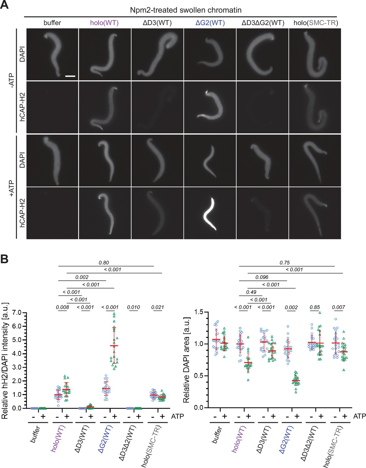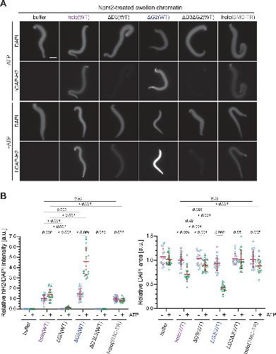 Figure 6. ATP-stimulated chromatin binding of condensin II can be recapitulated in an extract-free assay. (A) Xenopus sperm nuclei were pre-incubated with a buffer containing recombinant nucleoplasmin (Npm2) in the absence or presence of ATP for 30 min, and then holo(WT), ΔG2(WT), ΔD3(WT), ΔD3ΔG2(WT), or holo(TR) was added at 50 nM. After 120 min, reaction mixtures were fixed and labeled with anti-mSMC4 antibody. DNA was counterstained with DAPI. Shown here is a representative image from over 20 nuclei examined per condition. Scale bar, 10 µm. (B) (Left) Signal intensities of hCAP-H2 were divided by DAPI intensities and the mean values were normalized relative to the values by holo(WT) without ATP addition (-ATP). (Right) Areas of DAPI signals were measured and the mean values were normalized to values by holo(WT) without ATP addition (-ATP). The mean ± SD is shown (n=20 sperm nuclei). The p-values listed were assessed by two-tailed Welch’s t-test. SMC, structural maintenance of chromosomes; WT: wild-type. |