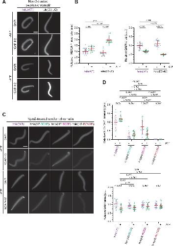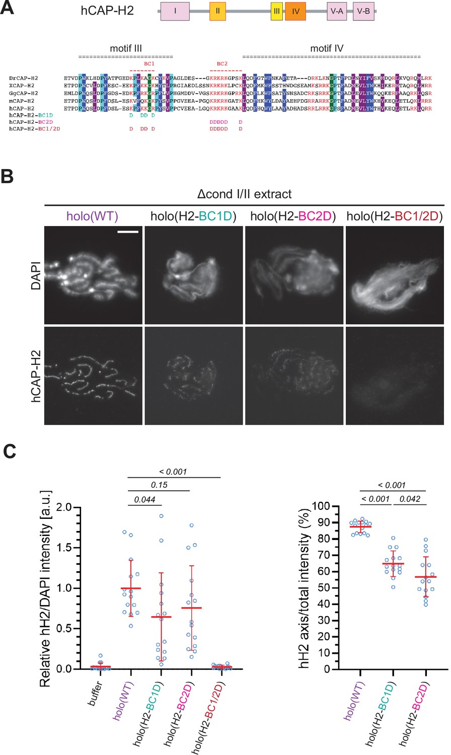 Figure 5. The basic amino acid clusters of CAP-H2 synergistically contribute to condensin II functions. (A) A schematic diagram of domain organization of hCAP-H2. CAP-H2 has five motifs that are well conserved among vertebrate species (motifs I to V). Shown here is a sequence alignment of the CAP-H2 orthologs from Danio rerio (DrCAP-H2), Xenopus laevis (XCAP-H2), Gallus gallus (GgCAP-H2), Mus musculus (mCAP-H2) and human (hCAP-H2). Conserved residues are labeled in dark blue (Y/F/W), light blue (P) and gray (I/M/L*). Within the central region, two basic amino acid clusters (BC1 and BC2 shown in red). The BC1D and BC2D mutations were created by substituting all basic residues (K/R) conserved in BC1 and BC2, respectively, with aspartic acid residues (D). The BC1/2D mutations are a combination of the BC1D and BC2D mutations. (B) Mouse sperm nuclei were incubated with Δcond I/II extracts that had been supplemented with holo(WT), holo(H2-BC1D), holo(H2-BC2D) and holo(H2-BC1/2D) at 200 nM. After 150 min, reaction mixtures were fixed and labeled with anti-hCAP-H2 antibody. DNA was counterstained with DAPI. Shown here is a representative image from over 15 chromosome clusters examined per condition. Scale bar, 10 µm. (C) (Left) Signal intensities of hCAP-H2 from the experiment described in (B) were divided by DAPI intensities and the mean values were normalized relative to the values by holo(WT). (Right) Signal intensities of hCAP-H2 accumulated at the axes were divided by the overall hCAP-H2 intensities on the chromosomal DNA and the mean values were normalized to the value by holo(WT). The mean ± SD is shown (n=15 chromosome clusters). The p-values listed were assessed by two-tailed Welch’s t-test. A dataset from a single representative experiment out of two repeats is shown. |