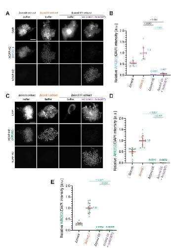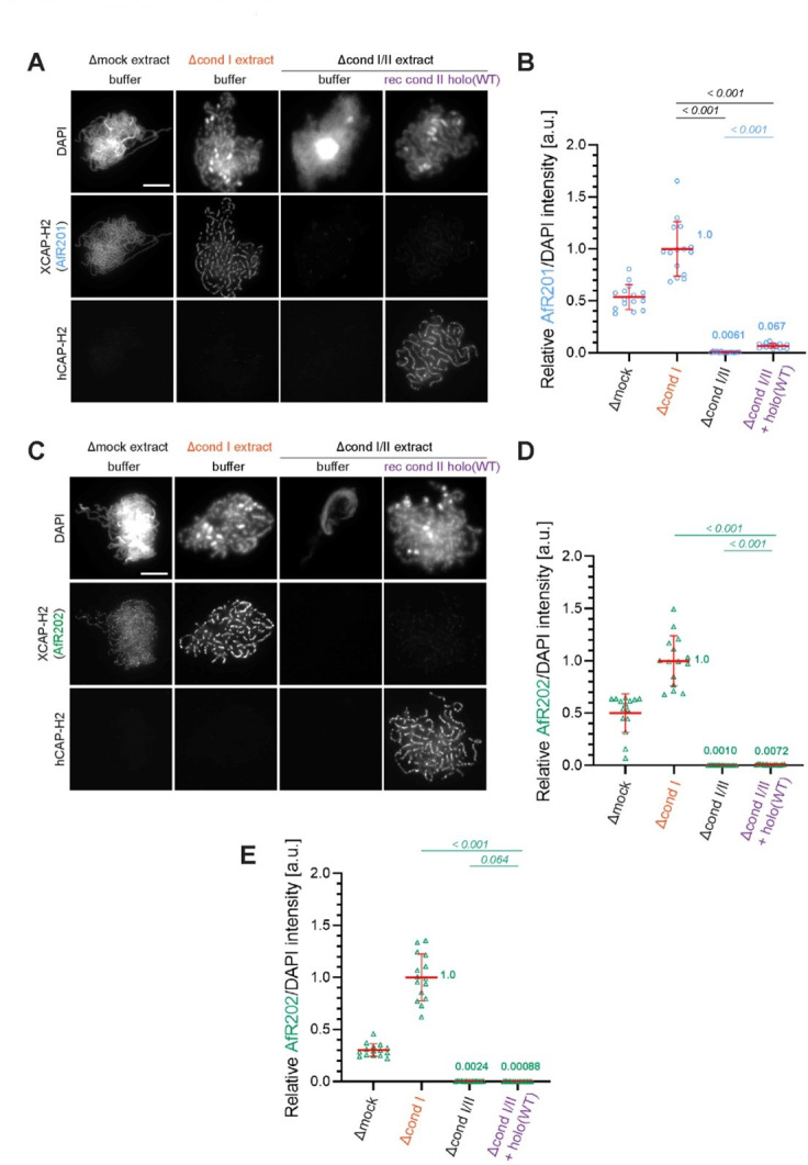 Author response image 1. Evidence that the faint immunofluorescence signal detected as XCAP-H2 on chenille-like chromosomes formed in the Δcond I/II +holo(WT) extract is an artifact.(A) Double labeling of chromatin/chromosomes with antibodies against XCAP-H2 (AfR201) and hCAP-H2. This panel was presented in Figure 1B in the original manuscript. (B) From the double-labeling experiment described in (A), signal intensities of XCAP-H2 were divided by DAPI signal intensities, and the mean values were normalized relatively to the value by Δcond I extract. The mean ± SD is shown (n = 15 chromosome clusters). Mean values were listed in bold. P values listed were assessed by two-tailed Welch’s t-test. (C) The double-labeling experiment was repeated using antibodies against XCAP-H2 (AfR202) and hCAP-H2. (D) From the double-labeling experiment described in (C), signal intensities of XCAP-H2 were divided by DAPI signal intensities and plotted as above. (E) From the single-labeling experiment shown in the revised Figure 1B, signal intensities of XCAP-H2 were divided by DAPI signal intensities and plotted as above. |