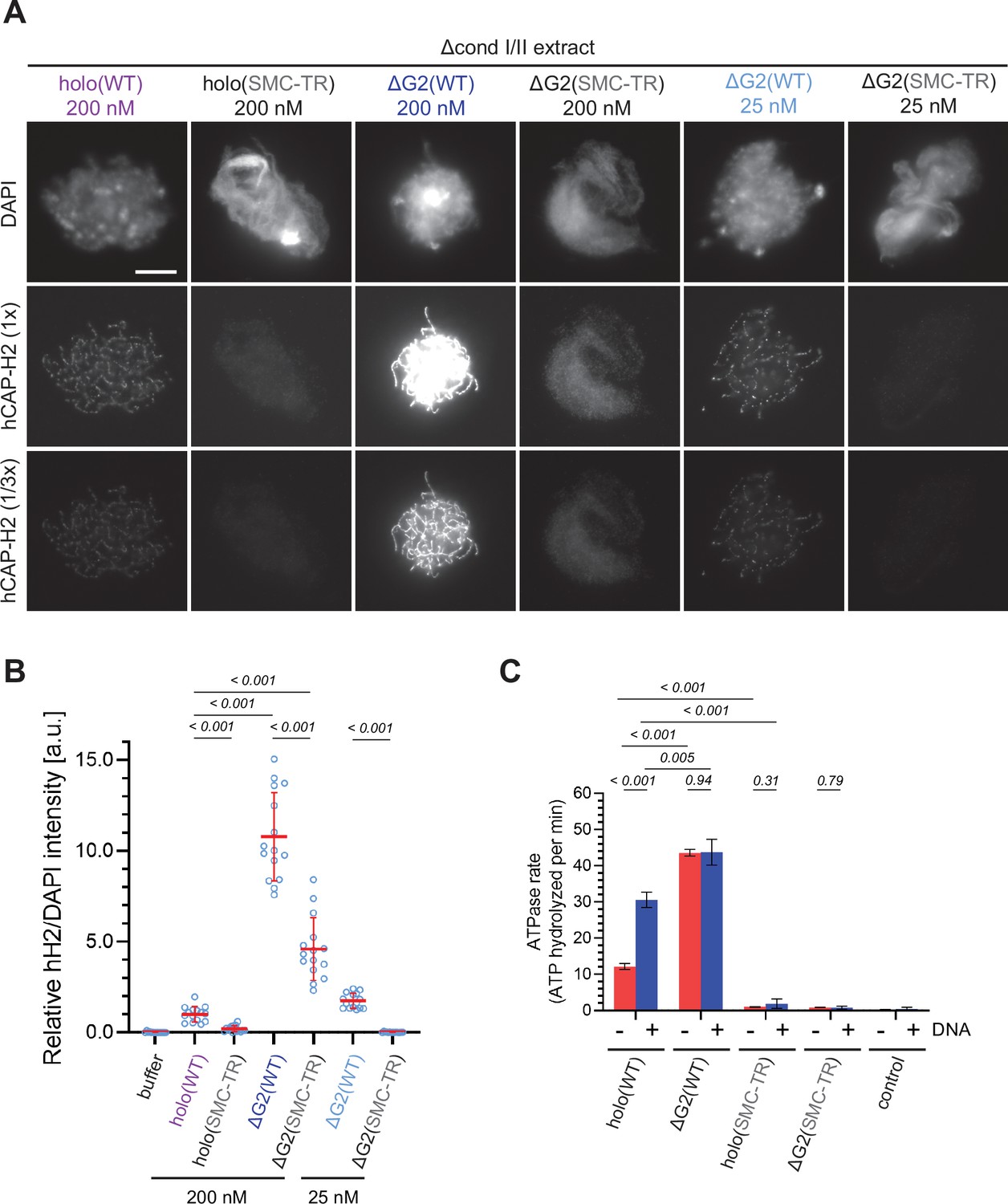 Figure 3. The structural maintenance of chromosome (SMC) ATPase cycle is essential for condensin II function. (A) Mouse sperm nuclei were incubated with Δcond I/II extracts that had been supplemented with condensin II holo(WT) and holo(SMC-TR) at 200 nM, or ΔG2(WT) and ΔG2(SMC-TR) at either 200 nM or 25 nM. After 150 min, reaction mixtures were fixed and labeled with anti-hCAP-H2 antibody. DNA was counterstained with DAPI. Shown here is a representative image from over 15 chromosome clusters examined per condition. The images of hCAP-H2 signal were first captured at a single exposure time (1/3 ×) and then increased digitally (1 ×) to visualize signals from chromosomes of complexes apart from ΔG2(WT) at 200 nM. Scale bar, 10 µm. (B) Signal intensities of hCAP-H2 from the experiment described in (A) were divided by DAPI intensities and the mean values were normalized relative to the value by holo(WT). The mean ± SD is shown (n=15 chromosome clusters). The p-values listed were assessed by two-tailed Welch’s t-test. A dataset from a single representative experiment out of two repeats is shown. (C) ATPase rates of recombinant condensin II holo(WT), ΔG2(WT), holo(SMC-TR), and ΔG2(SMC-TR) in the presence or absence of double-stranded DNA (dsDNA). The error bar represents the SD from three performed repeats. P values listed were assessed by two-tailed t-test. WT: wild-type. |