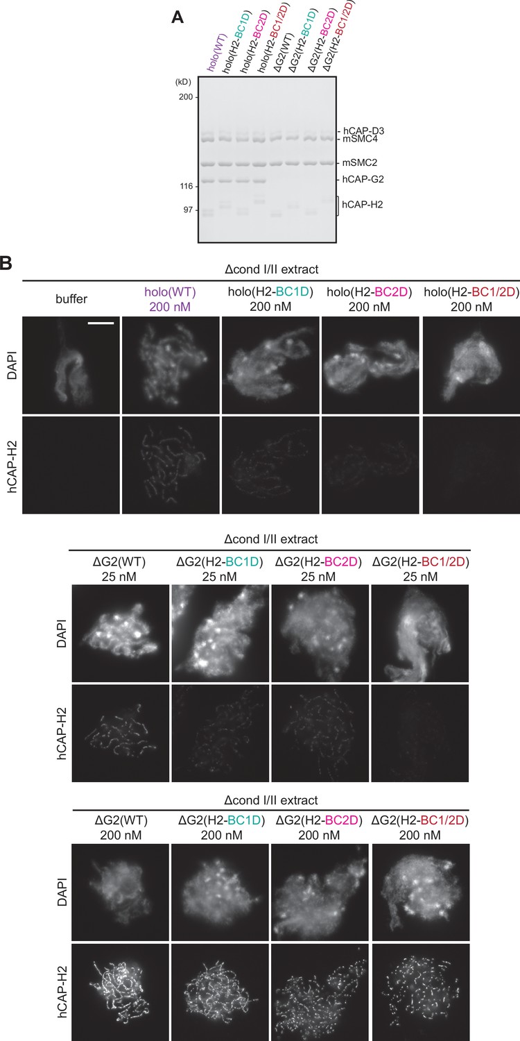 Figure 5—figure supplement 1. Deletion of CAP-G2 partially rescues mutations in the basic amino acid clusters of CAP-H2. (A) Recombinant mammalian condensin II holocomplex (holo) and ΔG2 subcomplex harboring either wild-type (WT) or mutations in the H2 basic amino acid cluster (H2-BC1D, H2-BC2D, and H2-BC1/2D) were purified and subjected to SDS-PAGE. The gel was stained with Coomassie Brilliant Blue. (B) Mouse sperm nuclei were incubated in Δcond I/II extracts that had been supplemented with condensin II holocomplex (WT, H2-BC1D, H2-BC2D, or H2-BC1/2D) at 200 nM or ΔG2 subcomplexes (WT, H2-BC1D, H2-BC2D, and H2-BC1/2D) at either 25 or 200 nM. After incubation for 150 min, reactions were fixed and labeled with anti-hCAP-H2 antibody. DNA was counterstained with DAPI. Shown here is a representative image from over 15 chromosome clusters examined per condition. Scale bar, 10 µm. In samples with 200 nM addition, ΔG2 subcomplexes were overloaded on chromosomal axes but only ΔG2(WT) made longer, continuous axes while ΔG2 with H2 basic cluster mutations. |